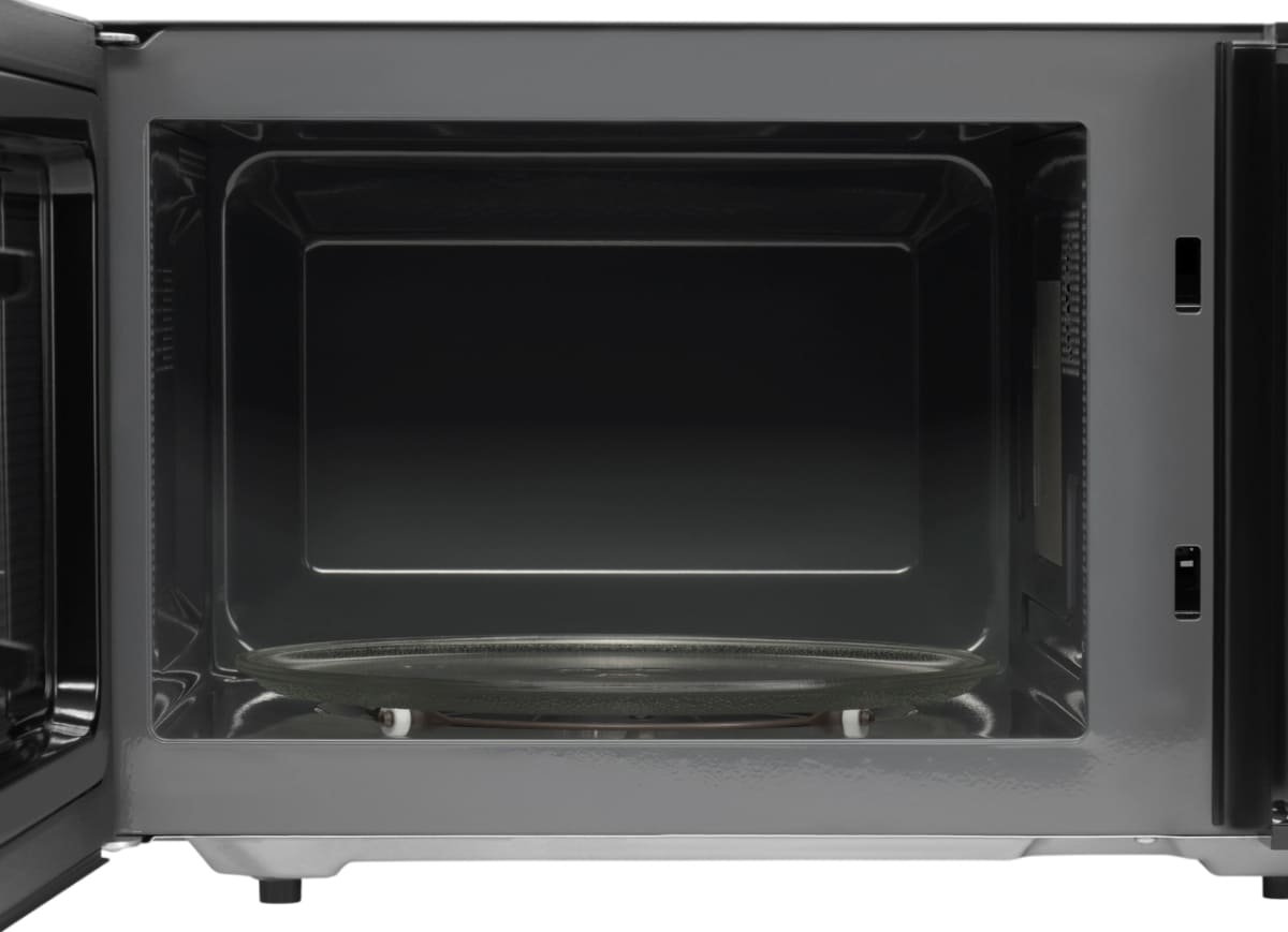 Материал внутренней поверхности — эмаль. Это самое распространенное покрытие, так как оно зарекомендовало себя высоким качеством, устойчивостью к механическим воздействиям и простотой ухода. Полезный объем для готовки — 23 л. Для установки и прогрева посуды используется классическое вращающееся блюдо. Для изменения настроек или выбора программ используются следующие переключатели: кнопочные + поворотные.