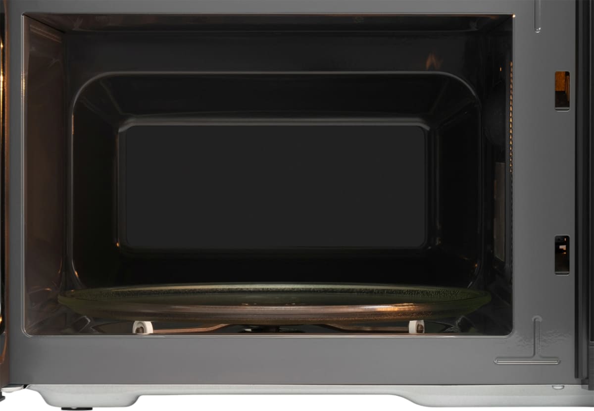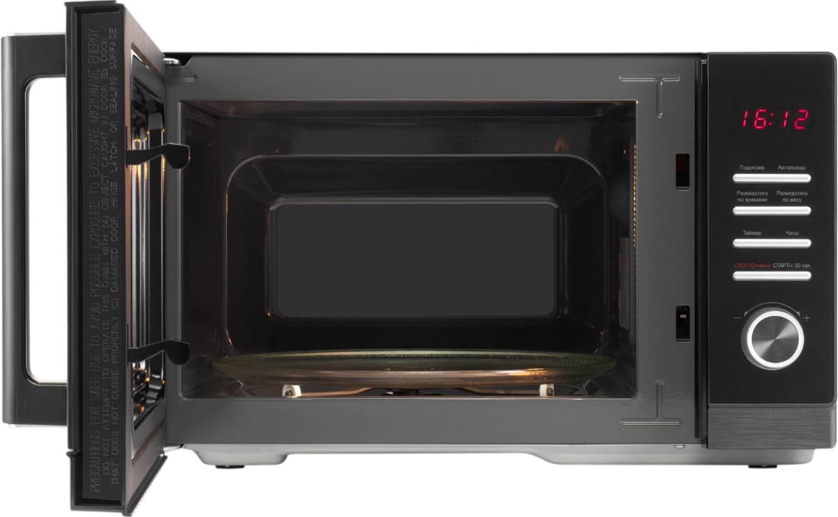 Материал внутренней поверхности — эмаль. Это самое распространенное покрытие, так как оно зарекомендовало себя высоким качеством, устойчивостью к механическим воздействиям и простотой ухода. Полезный объем для готовки — 25 л. Для установки и прогрева посуды используется классическое вращающееся блюдо. Для изменения настроек или выбора программ используются следующие переключатели: кнопочные + поворотные.