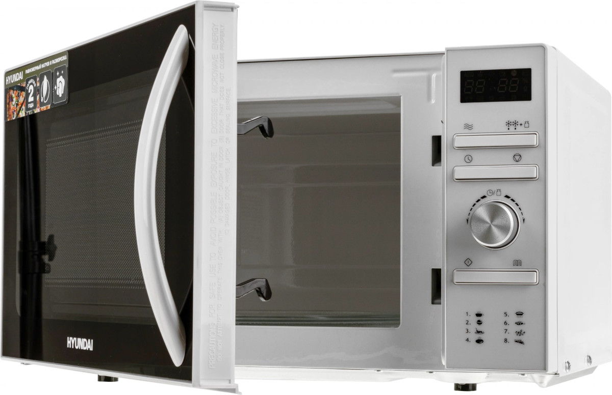 Количество режимов в данной модели Хендай: 3 шт. Для обработки продуктов и готовых блюд используются следующие виды нагрева: Микроволны, Автоматический режим разморозки, Автоматический режим приготовления. Если вы спешите, а еду нужно разогреть, используйте быстрый старт — благодаря ему 30 секунд прибор работает на полной мощности. Отдельная опция для размораживания продуктов и полуфабрикатов облегчает жизнь — не нужно самостоятельно настраивать параметры. Автоматические программы для приготовления добавлены производителем также для упрощения работы.