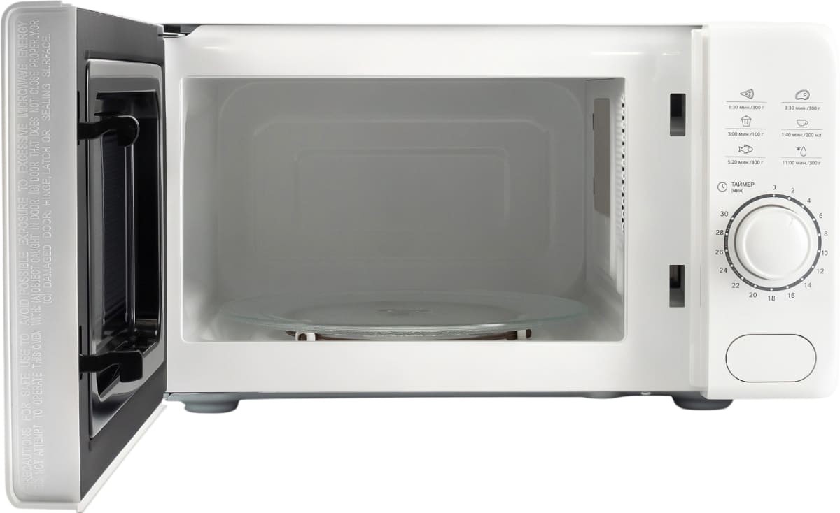 Материал внутренней поверхности — эмаль легкой очистки. Полезный объем для готовки — 20 л. Для установки и прогрева посуды используется классическое вращающееся блюдо. Стандартное механическое управление не вызовет трудностей ни у кого из вашей семьи. Для изменения настроек или выбора программ используются следующие переключатели: поворотные.