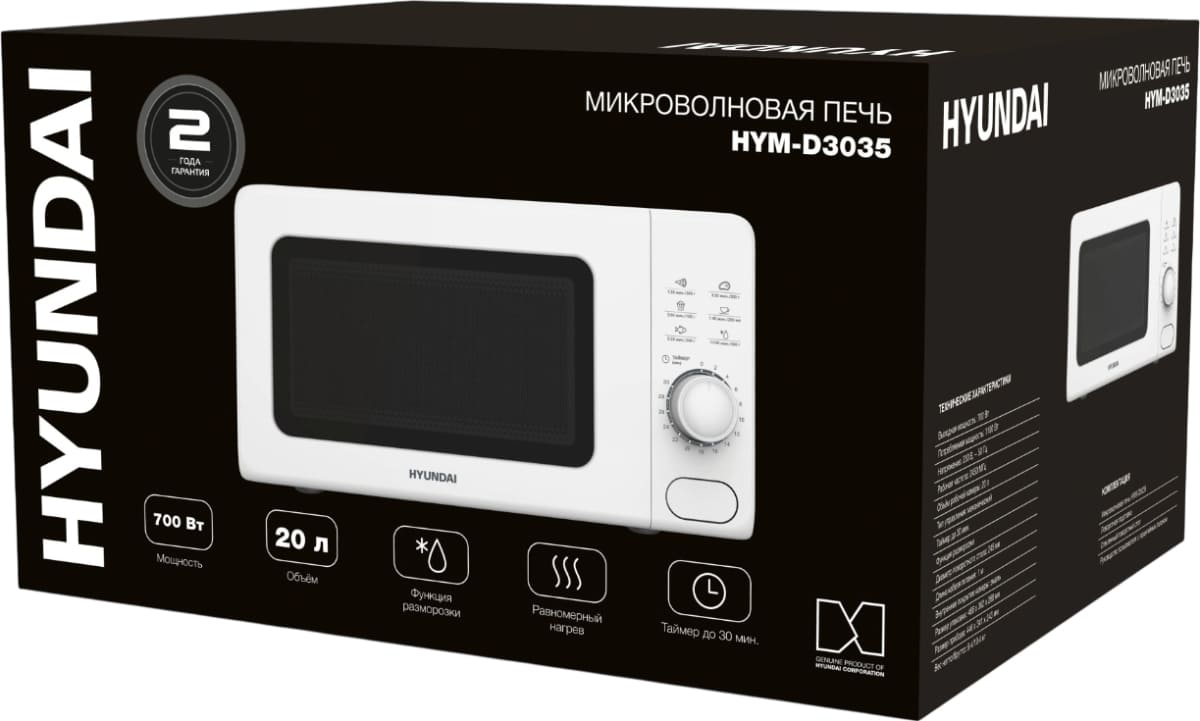 Отдельностоящая микроволновая печь Hyundai HYM-D3035 — компактное и полезное дополнение к уже имеющейся кухонной технике. Ее можно установить на шкаф, на свободную столешницу, но не рекомендуется ставить на другие приборы, например, холодильник. Цвет этой модели: белый.
