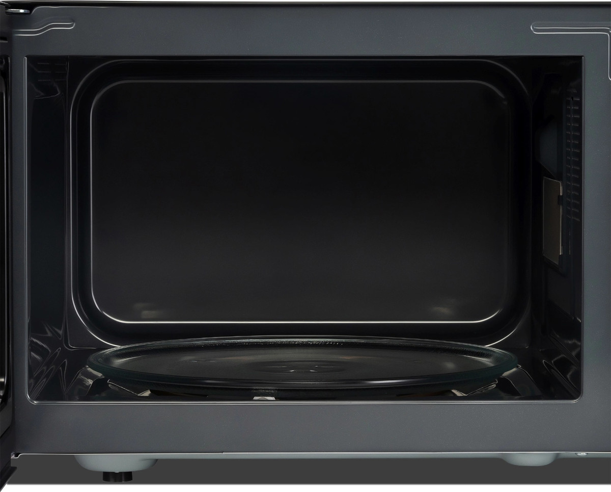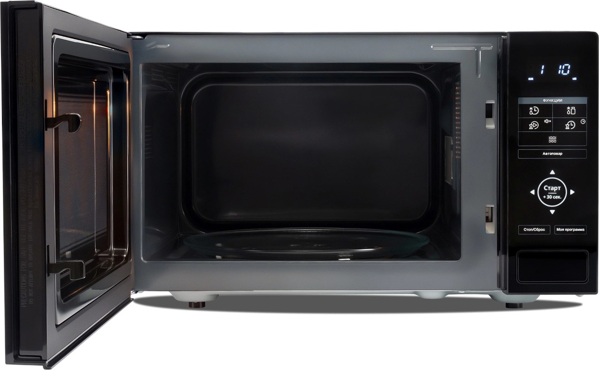 Материал внутренней поверхности — эмаль. Это самое распространенное покрытие, так как оно зарекомендовало себя высоким качеством, устойчивостью к механическим воздействиям и простотой ухода. Полезный объем для готовки — 23 л. Для установки и прогрева посуды используется классическое вращающееся блюдо. Понятное электронное управление не вызовет трудностей ни у кого из вашей семьи. Для изменения настроек или выбора программ используются следующие переключатели: сенсорные.
