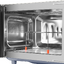 Камера выполнена из нержавеющей стали, а дно имеет керамическое покрытие для долговечности и простоты ухода. Нержавейка устойчива к коррозии и легко очищается от жира и брызг. Керамическое покрытие снижает прилипание и облегчает мытье после приготовления. Отсутствие поворотного стола увеличивает полезное пространство и удобно для прямоугольных форм посуды. В комплекте есть решетка, позволяющая готовить на двух уровнях и добиваться равномерной циркуляции горячего воздуха. Внутреннее освещение помогает контролировать процесс, не открывая дверцу.