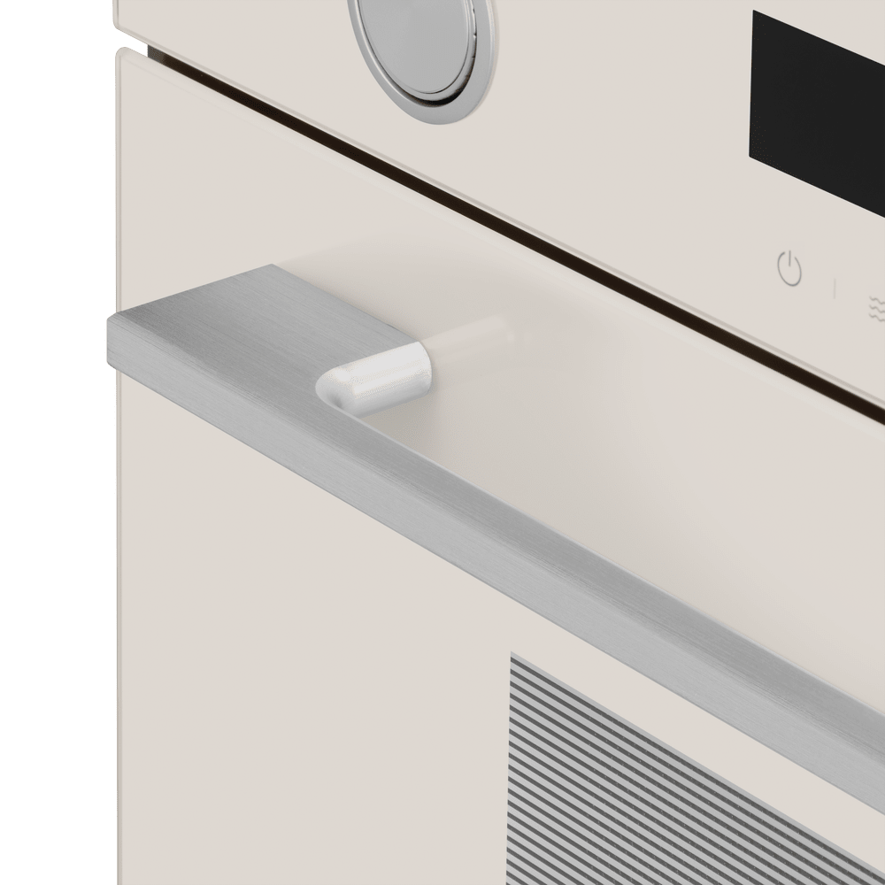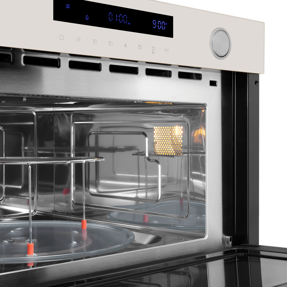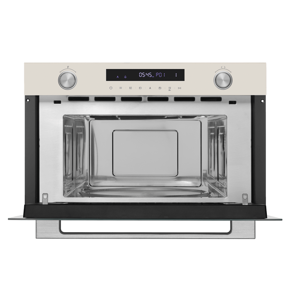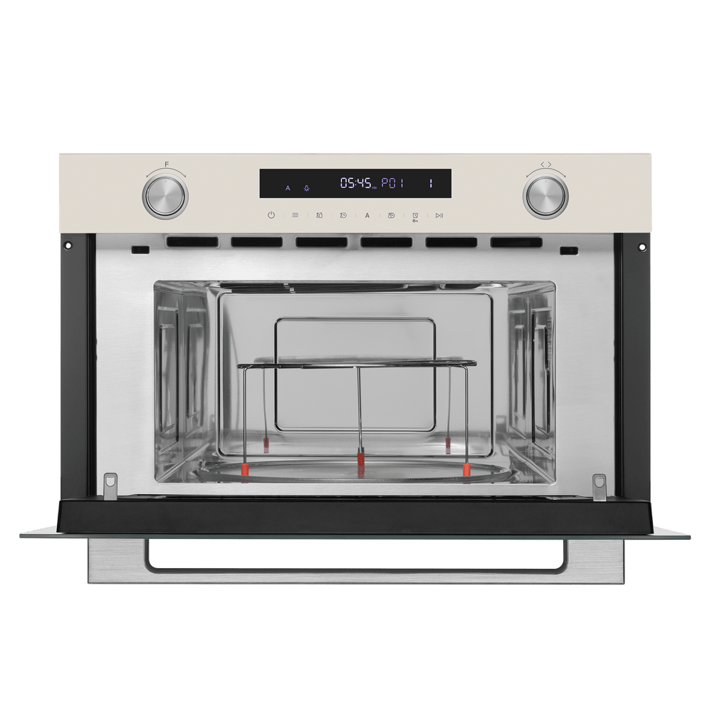 Более интересны цветовые решения для многофункциональных встраиваемых микроволновых печей. Эти приборы отличаются не только большей вместимостью, достаточно высокой ценой и широким набором возможностей, но и обширным выбором дизайнерских решений, а значит — и разнообразной по цвету фурнитурой. К ней можно отнести рукоятки поворотных переключателей, ручки-рейлинги у откидных дверей, элементы отделки. Кроме уже перечисленных оттенков, встроенные микроволновки могут оснащаться фурнитурой красного, золотого, серого цветов, а также оттенков меди и состаренного серебра.