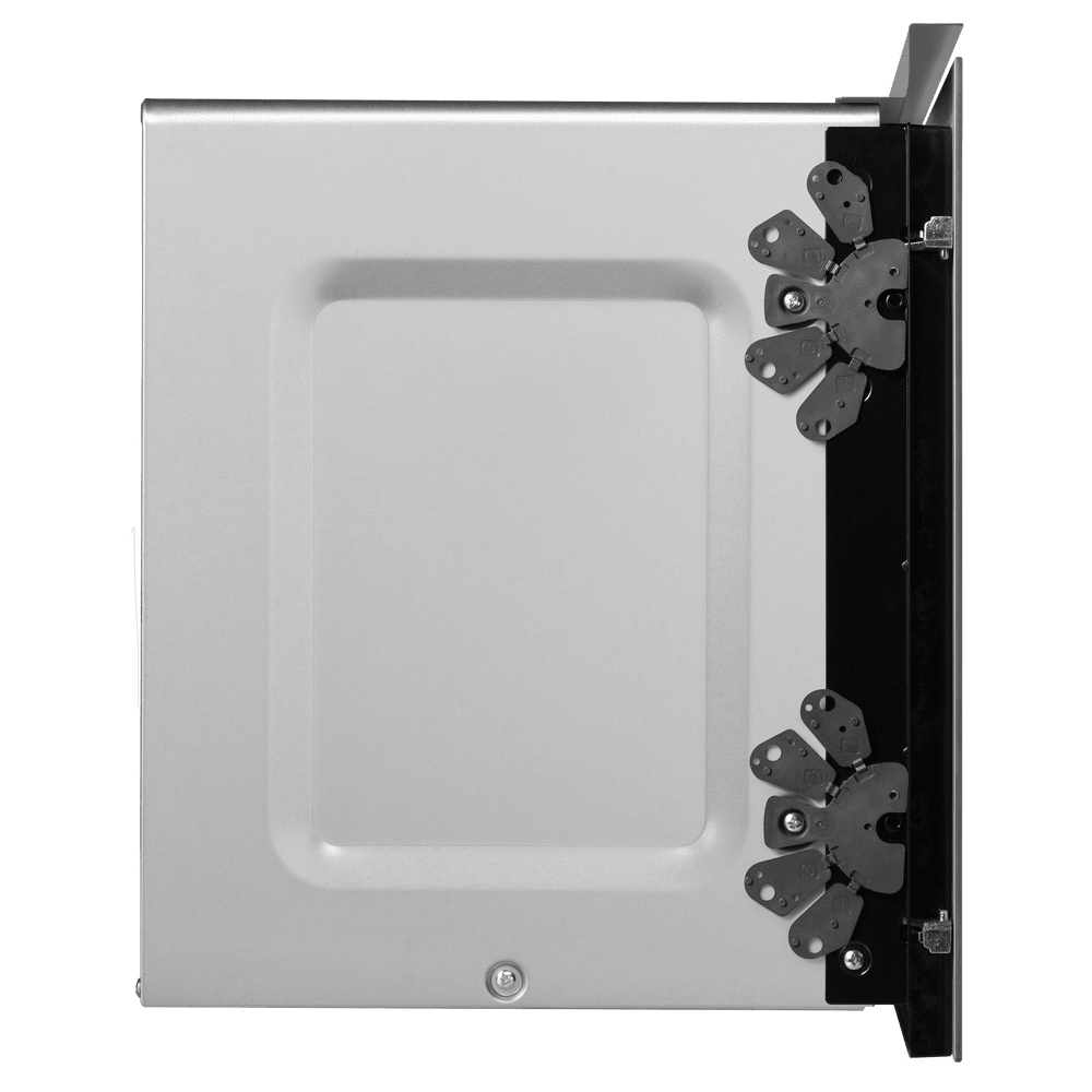 Прибор выглядит стильно: светлый корпус и фурнитура в нейтральном оттенке создают спокойную, ненавязчивую гамму, которая легко вписывается в большинство кухонных ансамблей. Компактный формат при габаритах 38.5×59.4×31.7 см экономит место при встраивании в тумбу или колонну, а подготовленная ниша 38.5×59.5×30.3 см обеспечивает точную подгонку при установке. Внутренняя камера с покрытием из нержавеющей стали не только презентабельно смотрится, но и удобна в уходе.