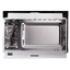 Микроволновые печи могут иметь навесную или откидную дверцу. Модели с навесной дверцей, запирающейся на механические защелки, могут быть как встраиваемыми, так и отдельно стоящими. Такие СВЧ-печи с дверцей, открывающейся влево или вправо, могут относиться к любой категории цен: от самых простых и дешевых до премиальных моделей. Недостатки дверцы с петлями сбоку — выступающая ручка, которая затрудняет очистку фасада, и небольшой угол открытия не более 90 градусов, который может препятствовать, например, размещению прибора в углу. Если ручка действительно мешает, стоит выбрать модель, дверца которой открывается нажатием на кнопку или прикосновением к сенсору на боковой панели управления.