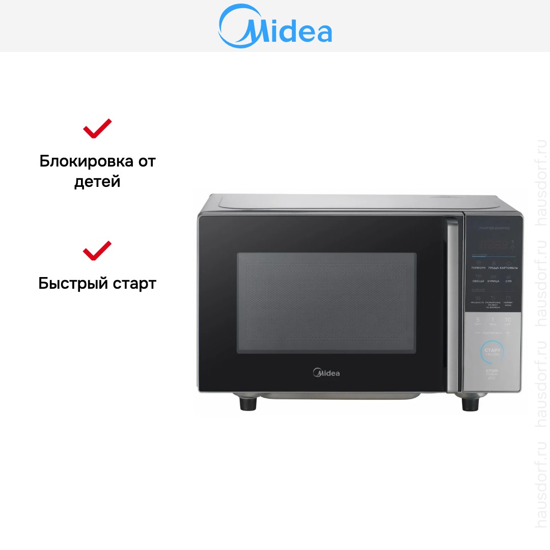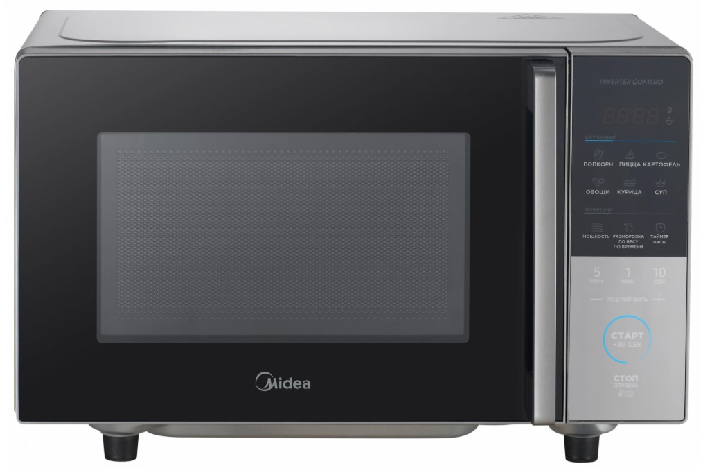 Для обработки продуктов и готовых блюд используются следующие виды нагрева: Микроволны. Если вы спешите, а еду нужно разогреть, используйте быстрый старт — благодаря ему 30 секунд прибор работает на полной мощности. Отдельная опция для размораживания продуктов и полуфабрикатов облегчает жизнь — не нужно самостоятельно настраивать параметры. Автоматические программы для приготовления добавлены производителем также для упрощения работы.
