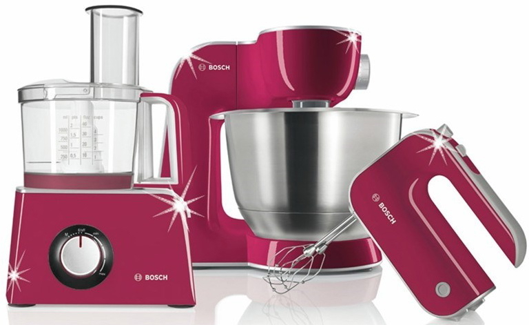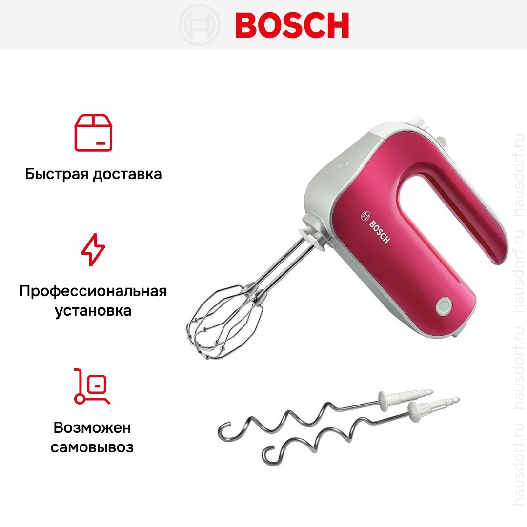 Обратите внимание на цвет миксера Бош — красный — он может стать как гармоничным дополнением кухонной обстановки, так и ярким акцентом. В комплекте с самим прибором идут дополнительные элементы: венчик для взбивания, крюки для теста.