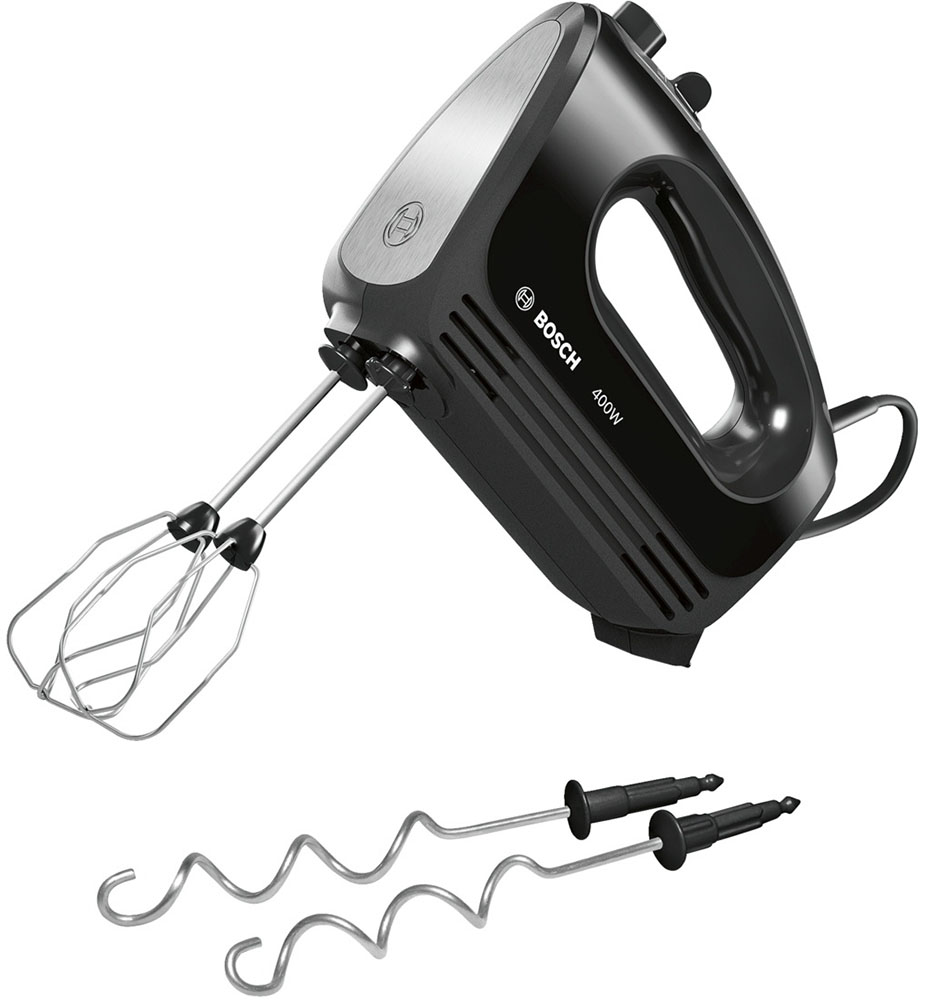 Обратите внимание на цвет миксера Бош — черный — он может стать как гармоничным дополнением кухонной обстановки, так и ярким акцентом. В комплекте с самим прибором идут дополнительные элементы: венчик для взбивания, крюки для теста.