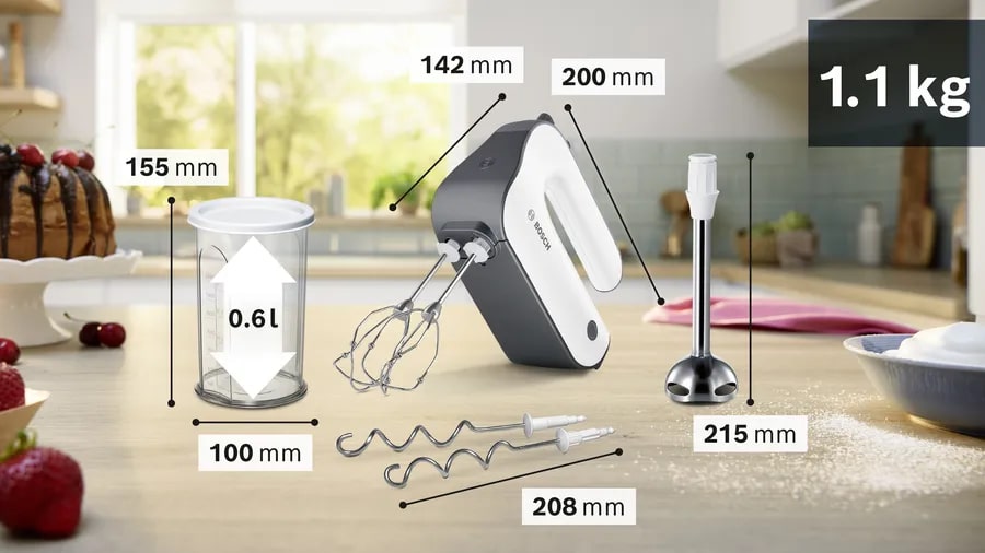 Габариты устройства — всего 14,2×20×7,5 см — позволяют разместить его даже на самой скромной кухонной поверхности или в небольшом шкафу. Вес в 1,1 кг обеспечивает комфортную работу без усталости в руке, а наличие чаши упрощает процесс смешивания ингредиентов без необходимости использовать дополнительную посуду. Упаковка имеет размеры 20,5×8×12 см, что облегчает транспортировку и хранение.