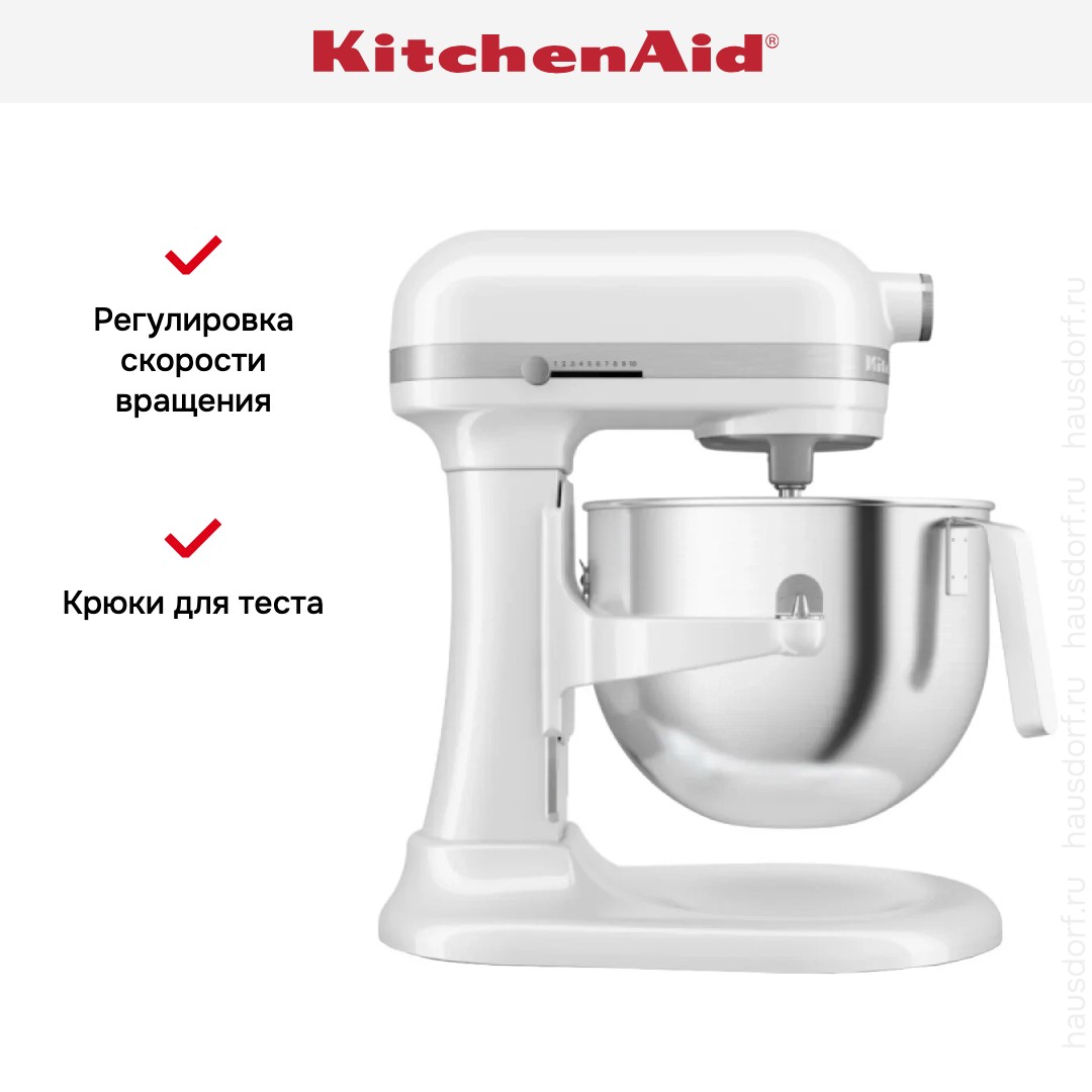 Обратите внимание на цвет миксера Китчен Эйд — белый — он может стать как гармоничным дополнением кухонной обстановки, так и ярким акцентом. В комплекте с самим прибором идут дополнительные элементы: венчик для взбивания, крюки для теста, лопатка с гибким ребром.