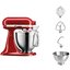 Обратите внимание на цвет миксера Китчен Эйд — красный — он может стать как гармоничным дополнением кухонной обстановки, так и ярким акцентом. В комплекте с самим прибором идут дополнительные элементы: венчик для взбивания, крюки для теста, насадка-лопатка для перемешивания, чаша из нержавеющей стали объемом 3 л, прозрачный защитный обод.