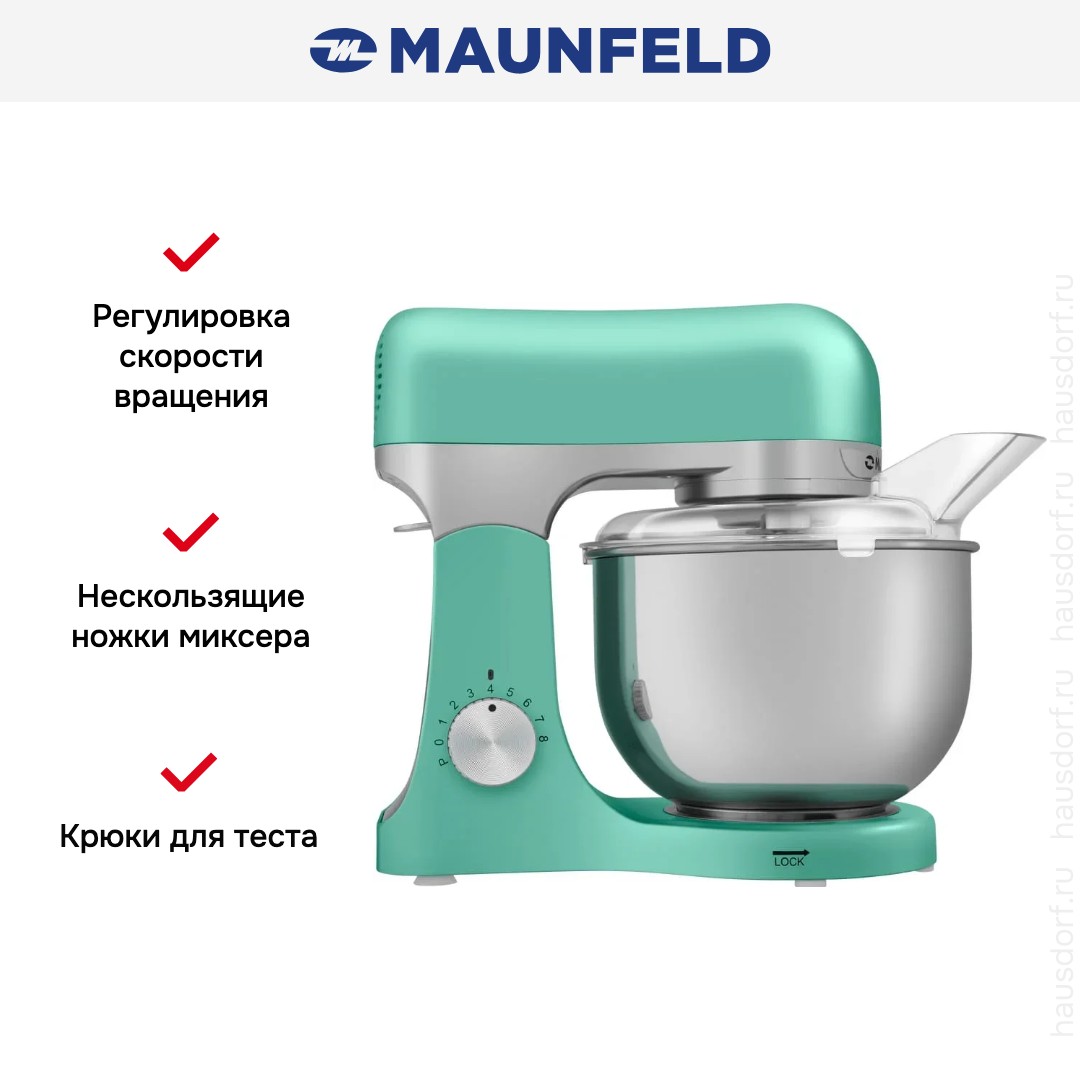 Миксер Maunfeld MF-422MINT — мощная и стильная стационарная техника, созданная для тех, кто серьёзно относится к кулинарии и ценит надёжность в сочетании с эстетикой. Необычный мятно-зелёный оттенок корпуса из прочного металла придаёт устройству яркий, современный облик, выгодно выделяя его среди стандартных моделей. Такой дизайн не только радует глаз, но и подчёркивает индивидуальность кухонного пространства.