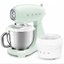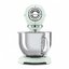 Обратите внимание на цвет миксера Смег — пастельно-зеленый — он может стать как гармоничным дополнением кухонной обстановки, так и ярким акцентом. В комплекте с самим прибором идут дополнительные элементы: венчик для взбивания, защитная крышка на чашу, крюки для теста, лопатка с гибким ребром. Вы можете приобрести и установить другие насадки, для них создано специальное гнездо.