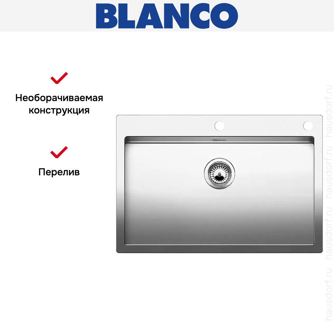 Обратите внимание на дизайнерские отличия мойки Бланко, которые помогут в создании идеальной кухни в вашем доме. Она выполнена в цвете нержавеющая сталь. Основной материал — нержавеющая сталь, он гарантирует надежность и долгие годы службы без повреждений. У этого покрытия приятная полированная текстура.