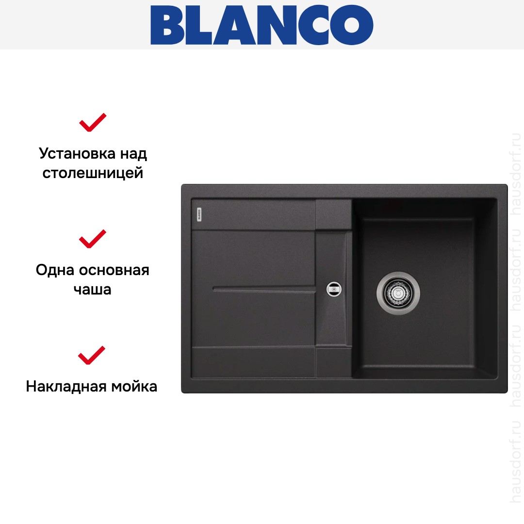 Накладная мойка Blanco — отличный выбор для тех, кто хочет создать гармоничное пространство с удобной сантехникой. простой в установке. Преимущество такой конструкции: легко подобрать практически к любой кухне и не придется демонтировать вместе с тумбой при ремонте или перестановке остальной мебели. Данная модель имеет стандартную форму, поэтому подходит большинству пользователей. Устанавливается над столешницей: это самый простой способ монтажа, зачастую с ним можно справиться даже без специалистов, главное — правильно рассчитать размеры ниши.