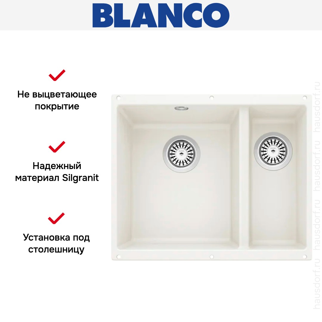 Обратите внимание на дизайнерские отличия мойки Бланко, которые помогут в создании идеальной кухни в вашем доме. Она выполнена в цвете белый. Основной материал — Silgranit, он гарантирует надежность и долгие годы службы без повреждений.