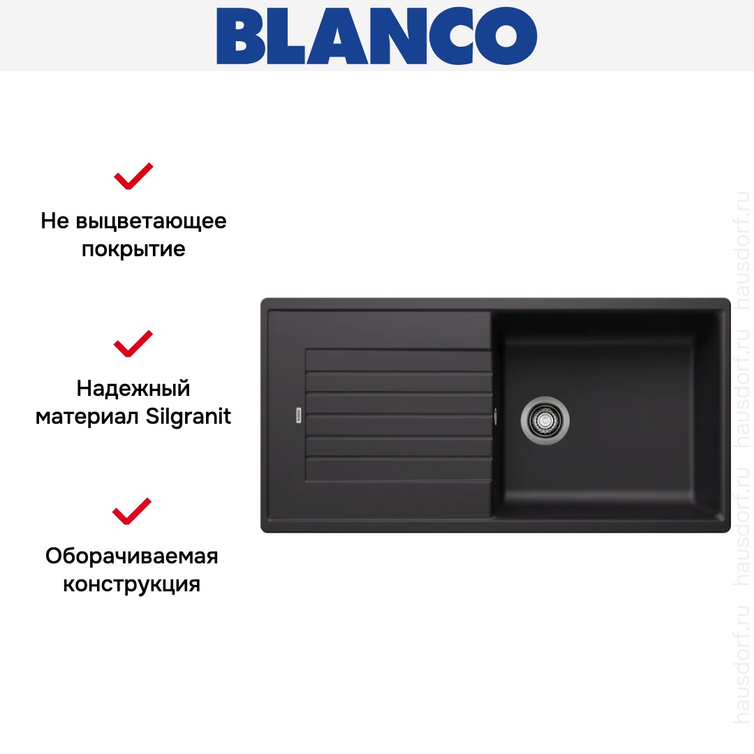 Обратите внимание на дизайнерские отличия мойки Бланко, которые помогут в создании идеальной кухни в вашем доме. Она выполнена в цвете черный. Основной материал — Silgranit, он гарантирует надежность и долгие годы службы без повреждений. Крыло, расположенное слева или справа, является дополнительным рабочим пространством, на котором можно сушить посуду, разделывать мясо и нарезать овощи.