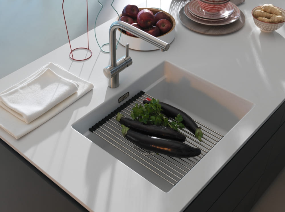 Интегрированная — встраиваемая модель из того же материала, что и столешница. Благодаря этому она выглядит как часть мебели.