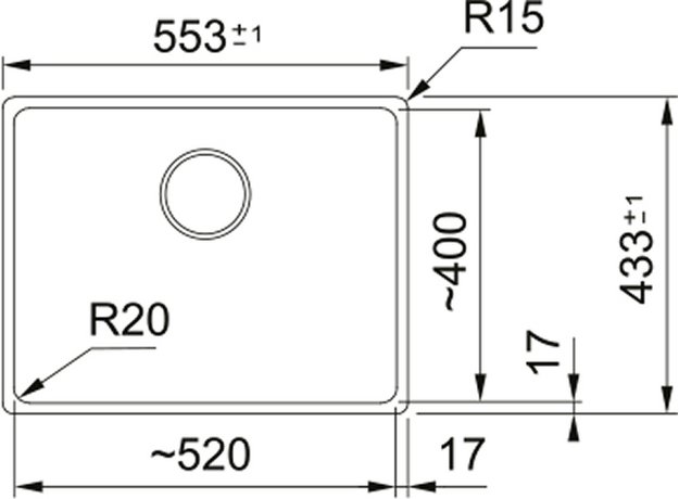 Глубина чаши 43,3 см обеспечивает удобство при выполнении различных задач — от мытья посуды до обработки продуктов — и эффективно предотвращает разбрызгивание жидкости. Внутренние углы закруглены радиусом 2 см, что придает чаше мягкость и облегчает очистку, а внешний контур имеет более четкие, но все же сглаженные линии с радиусом 1,5 см, что подчеркивает современный и аккуратный дизайн.