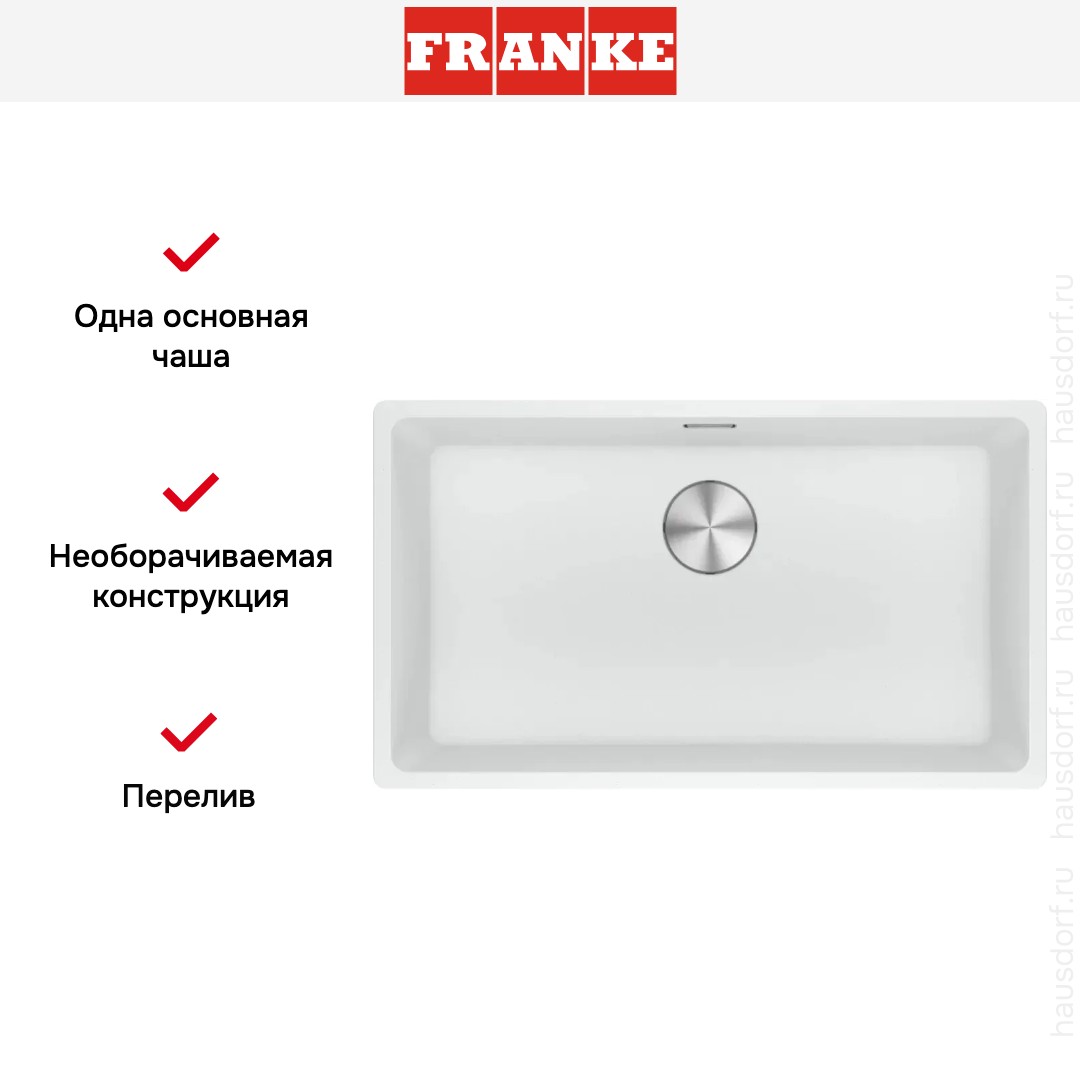 Обратите внимание на дизайнерские отличия мойки Франке, которые помогут в создании идеальной кухни в вашем доме. Она выполнена в цвете белый. Основной материал — фрагранит, он гарантирует надежность и долгие годы службы без повреждений.