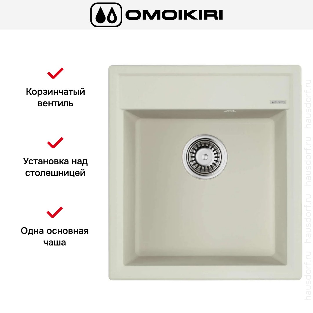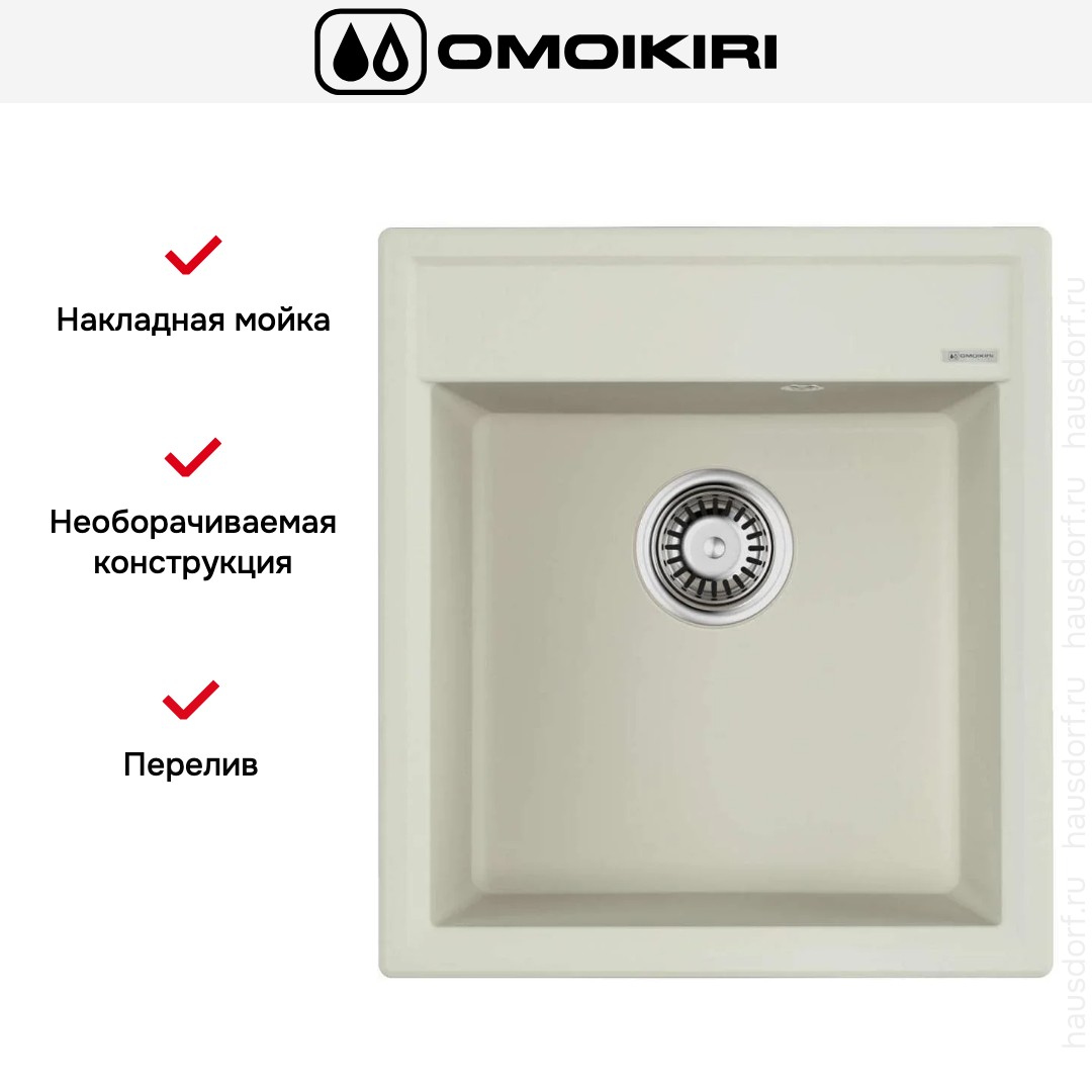 Накладная мойка Omoikiri — отличный выбор для тех, кто хочет создать гармоничное пространство с удобной сантехникой. простой в установке. Преимущество такой конструкции: легко подобрать практически к любой кухне и не придется демонтировать вместе с тумбой при ремонте или перестановке остальной мебели. Данная модель имеет стандартную форму, поэтому подходит большинству пользователей. Устанавливается над столешницей: это самый простой способ монтажа, зачастую с ним можно справиться даже без специалистов, главное — правильно рассчитать размеры ниши.