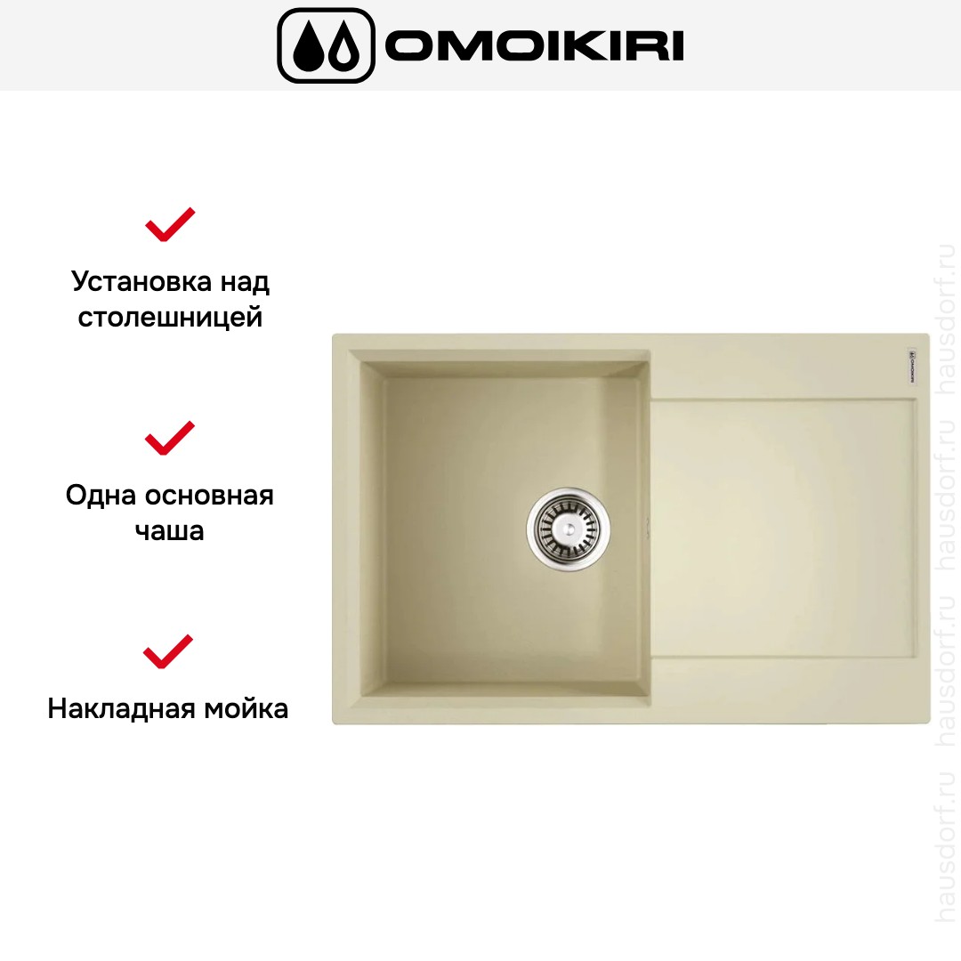 Накладная мойка Omoikiri — отличный выбор для тех, кто хочет создать гармоничное пространство с удобной сантехникой. простой в установке. Преимущество такой конструкции: легко подобрать практически к любой кухне и не придется демонтировать вместе с тумбой при ремонте или перестановке остальной мебели. Данная модель имеет стандартную форму, поэтому подходит большинству пользователей. Устанавливается над столешницей: это самый простой способ монтажа, зачастую с ним можно справиться даже без специалистов, главное — правильно рассчитать размеры ниши.