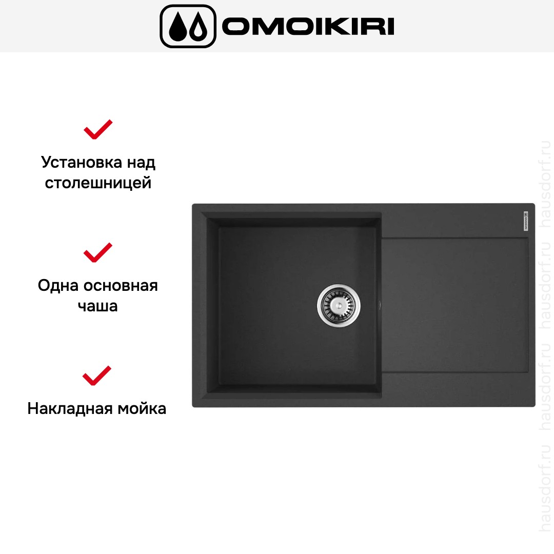 Накладная мойка Omoikiri — отличный выбор для тех, кто хочет создать гармоничное пространство с удобной сантехникой. простой в установке. Преимущество такой конструкции: легко подобрать практически к любой кухне и не придется демонтировать вместе с тумбой при ремонте или перестановке остальной мебели. Данная модель имеет стандартную форму, поэтому подходит большинству пользователей. Устанавливается над столешницей: это самый простой способ монтажа, зачастую с ним можно справиться даже без специалистов, главное — правильно рассчитать размеры ниши.