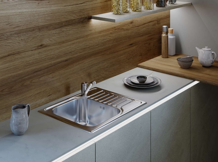 вровень со столешницей — создается ощущение бесшовного пространства, а если мойка сделана из того же материала, то и единого дизайна;