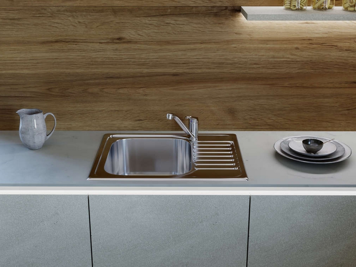 Накладная мойка — самая простая в установке и подключении. Она буквально «надевается» сверху кухонного шкафа вместо столешницы и может быть закреплена на готовой тумбе, без необходимости включать ее в проект на этапе дизайна. Ее можно легко самостоятельно подключить к коммуникациям, а также заменить в дальнейшем.