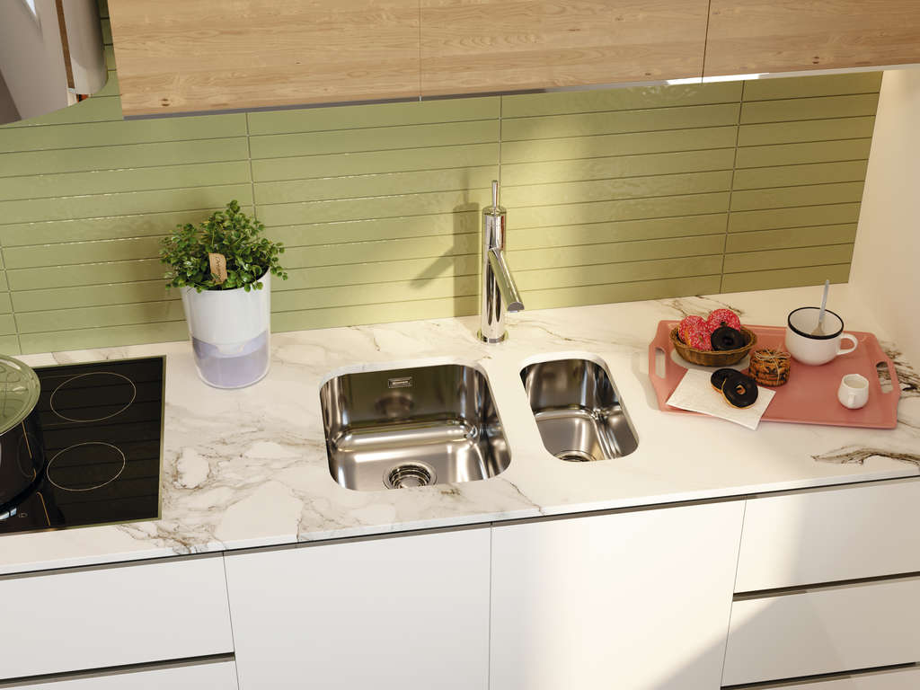 - Установка под столешницу обеспечивает ровный переход и визуально увеличивает рабочую поверхность.