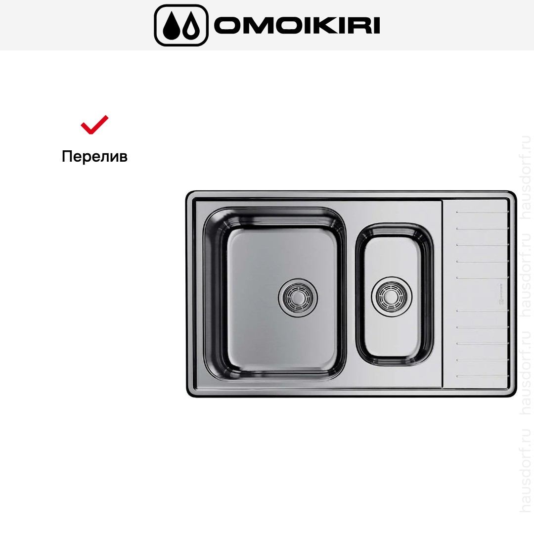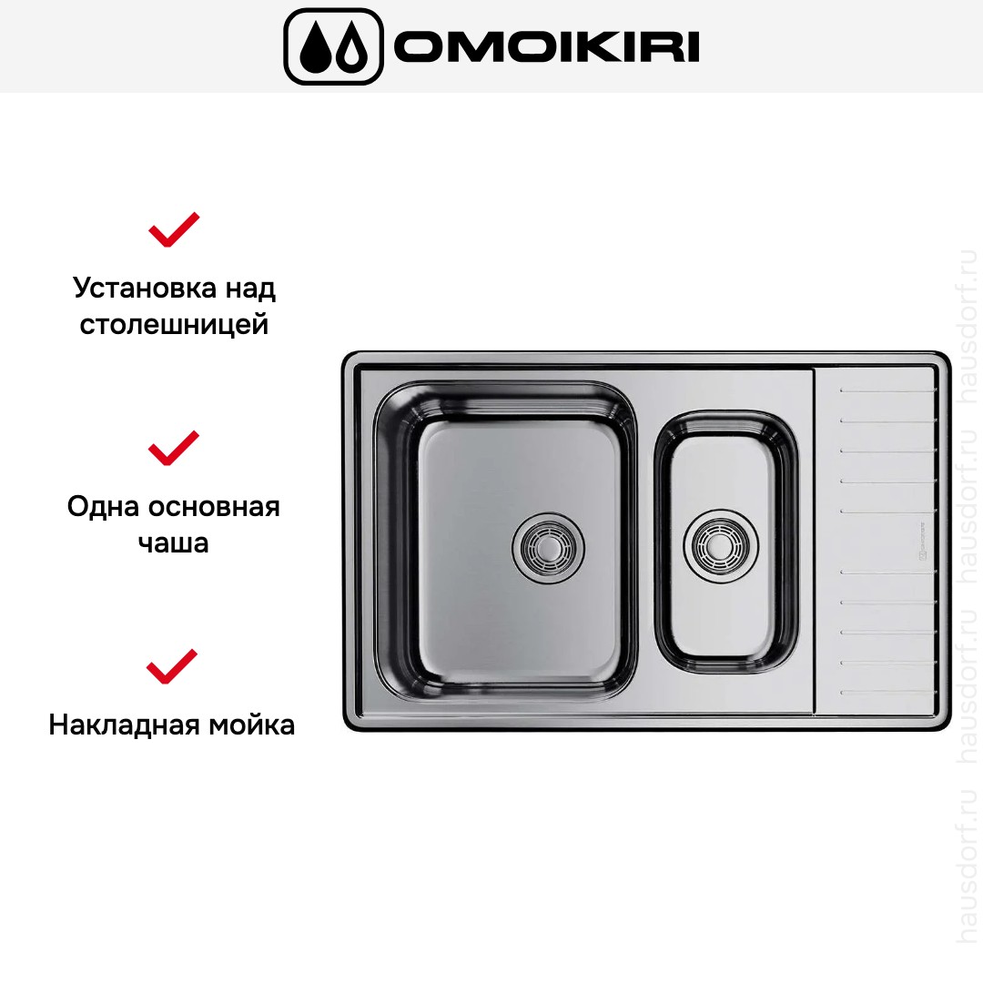 Мойка OMOIKIRI Sagami 79-2-in — накладная прямоугольная модель шириной 79 см и глубиной 50 см. Её лаконичный профиль и классический металл подойдут к разным стилям кухни, от минимализма до лофта. Компактные габариты 79×50 см экономят пространство, но сохраняют удобство повседневной работы у мойки. Установка над столешницей упрощает монтаж и позволяет при необходимости быстро заменить изделие без серьёзных перестроек. Для корректной посадки важно учитывать ширину базы 60 см и габариты выреза 77×48 см.
