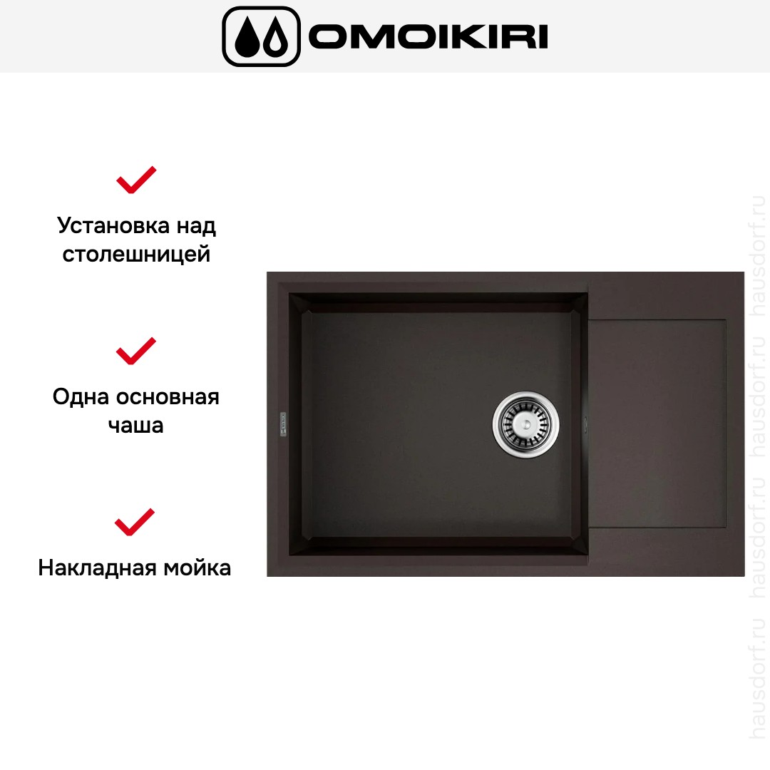 Мойка OMOIKIRI Sakaime 78-LB-ES — стильное и практичное решение для современной кухни. Внешний облик выполнен в тёплом оттенке «эспрессо», который мягко сочетается с декором из дерева и тёмными столешницами. Прямоугольная форма и аккуратные линии визуально упрощают рабочую зону, а накладной способ установки подчёркивает чистоту стыков и облегчает монтаж. Размеры 78×50 см делают изделие гармоничным для стандартной мебели и создают удобную рабочую поверхность.