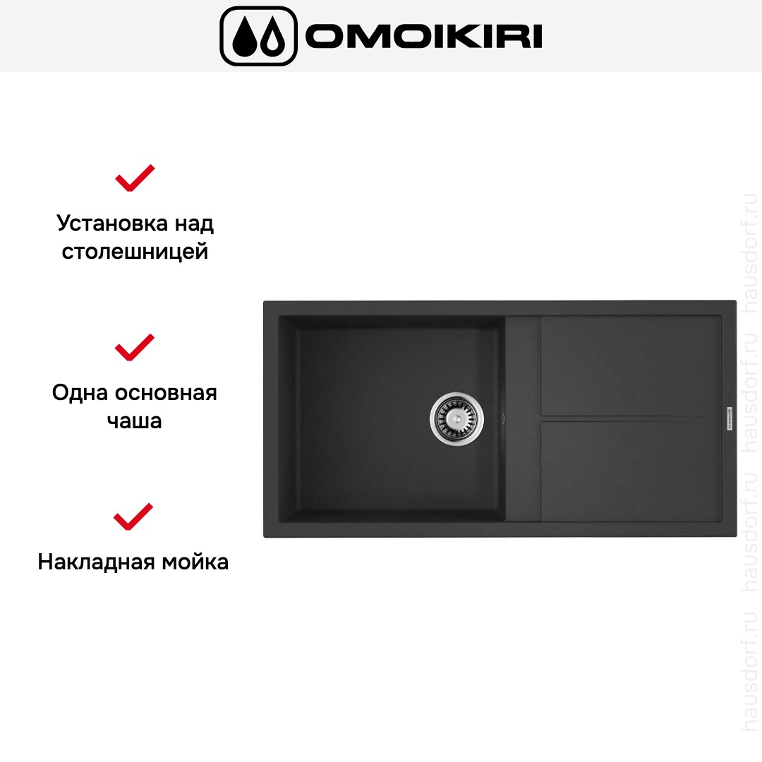 Мойка OMOIKIRI Sumi 100 BL — накладная прямоугольная модель в элегантном черном цвете, созданная для современных кухонь. Ее габариты 100×50 см обеспечивают оптимальный баланс между вместительностью и экономией места. Установка над столешницей упрощает монтаж и делает замену старой мойки быстрой и аккуратной. Ширина базы 60 см и размеры монтажного отверстия 98×48 см соответствуют распространенным стандартам кухонной мебели.
