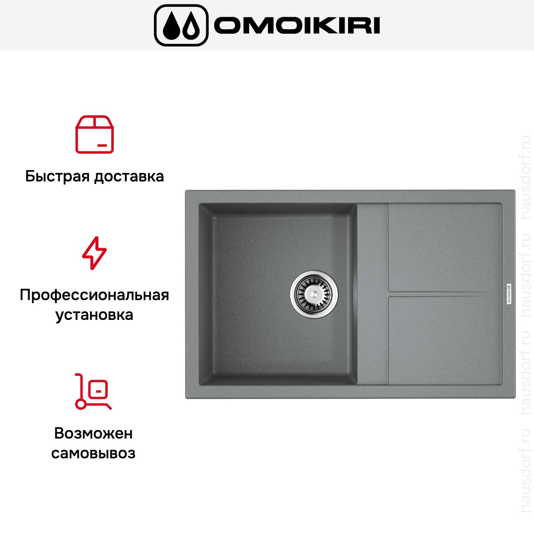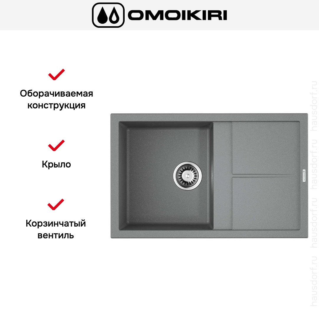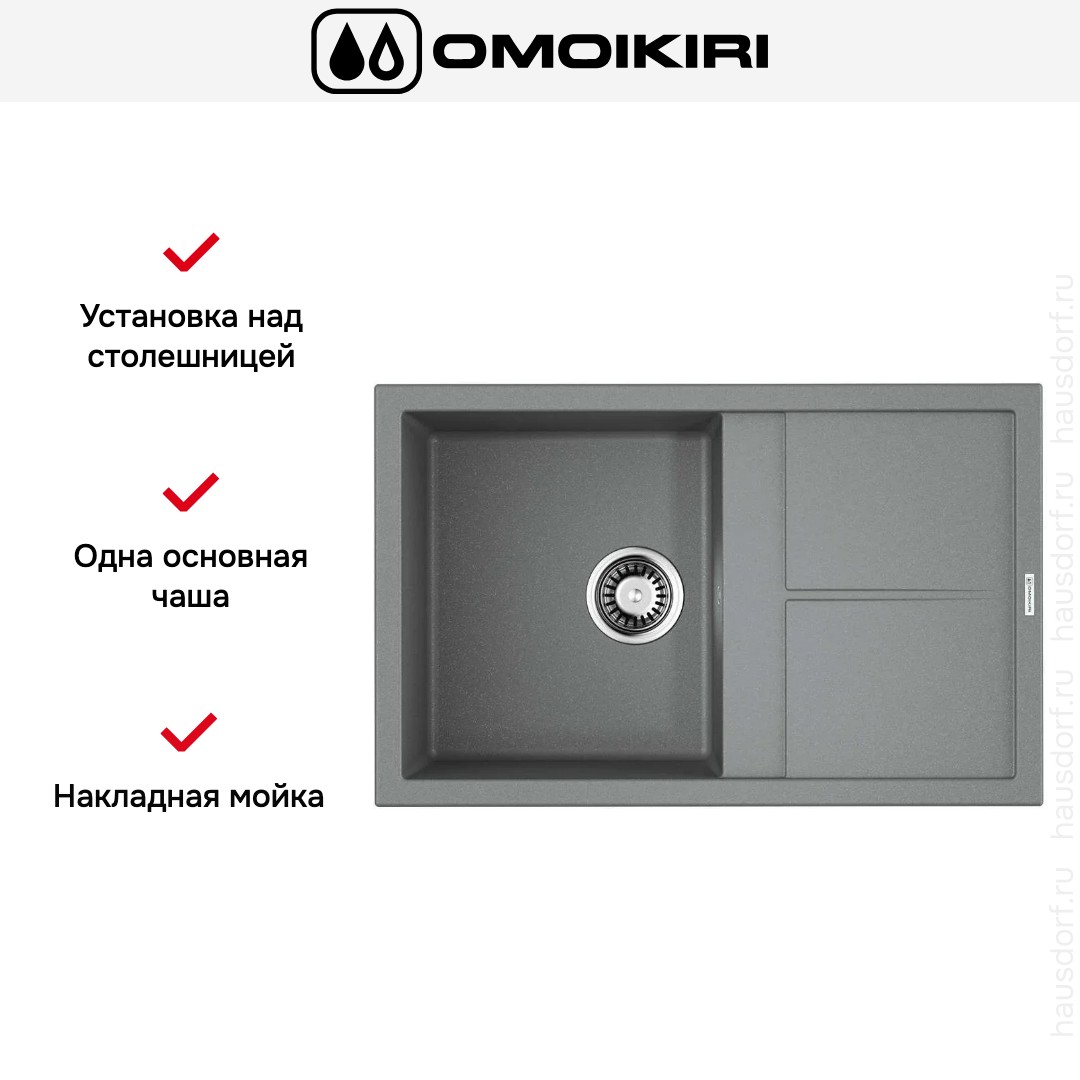 Мойка OMOIKIRI Sumi 79 GR — накладная прямоугольная модель шириной 79 см и глубиной 50 см. Она выполнена в сдержанном цвете Серый Ленинград, который легко вписывается в разные интерьерные решения. Открытая форма и четкие геометрические линии придают кухонному гарнитуру аккуратный современный вид. Наличие рабочего крыла делает композицию более функциональной и удобной для сушки посуды и подготовки продуктов. Оборачиваемая конструкция позволяет адаптировать изделие под левую или правую компоновку, что повышает гибкость планировки.