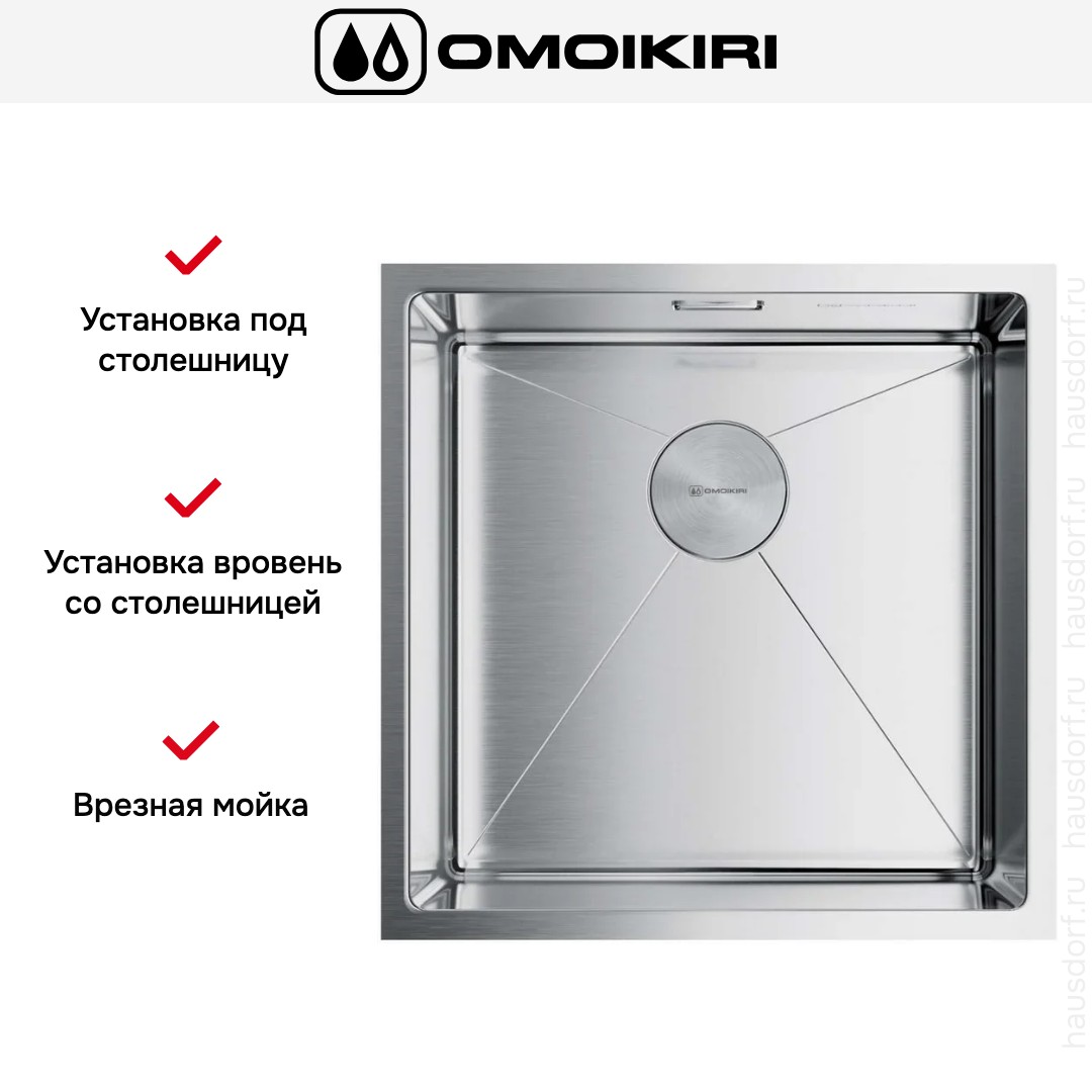Врезная мойка Omoikiri — отличный выбор для тех, кто хочет создать гармоничное кухонное пространство с полностью вписывающейся в него сантехникой. Преимущество такой конструкции — плотное прилегание к столешнице, так как вырез подбирается индивидуально под габариты модели. Под стыки не попадает вода, поэтому срок службы значительно увеличивается, пользоваться ей удобно и приятно. Данная модель имеет стандартную форму, поэтому подходит большинству пользователей. Устанавливается вровень со столешницей, благодаря чему не остается стыков, в которых копились бы загрязнения. Устанавливается под столешницу, благодаря чему не остается стыков, в которых копились бы загрязнения, а также увеличивается рабочая глубина. Устанавливается над столешницей: это самый простой способ монтажа, зачастую с ним можно справиться даже без специалистов, главное — правильно рассчитать размеры ниши.
