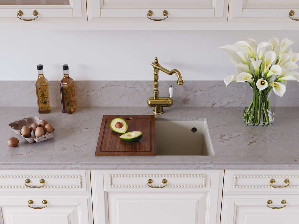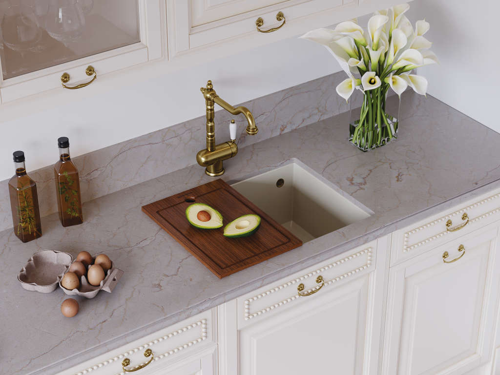 вровень со столешницей — создается ощущение бесшовного пространства, а если мойка сделана из того же материала, то и единого дизайна;