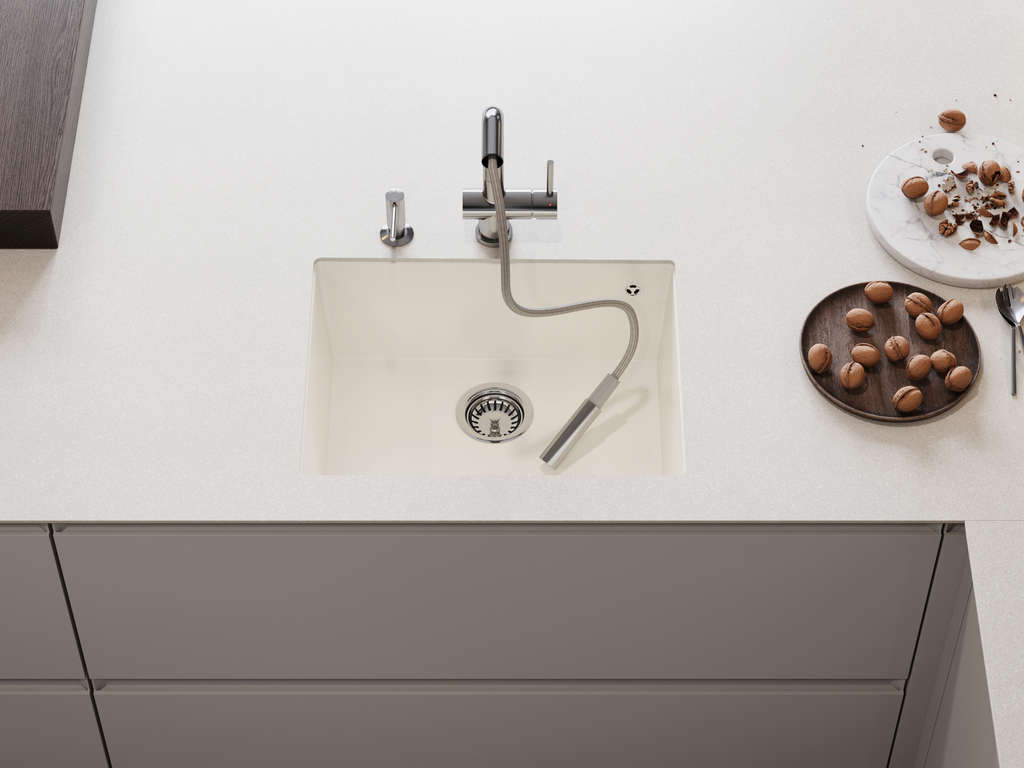 Интегрированная — встраиваемая модель из того же материала, что и столешница. Благодаря этому она выглядит как часть мебели.