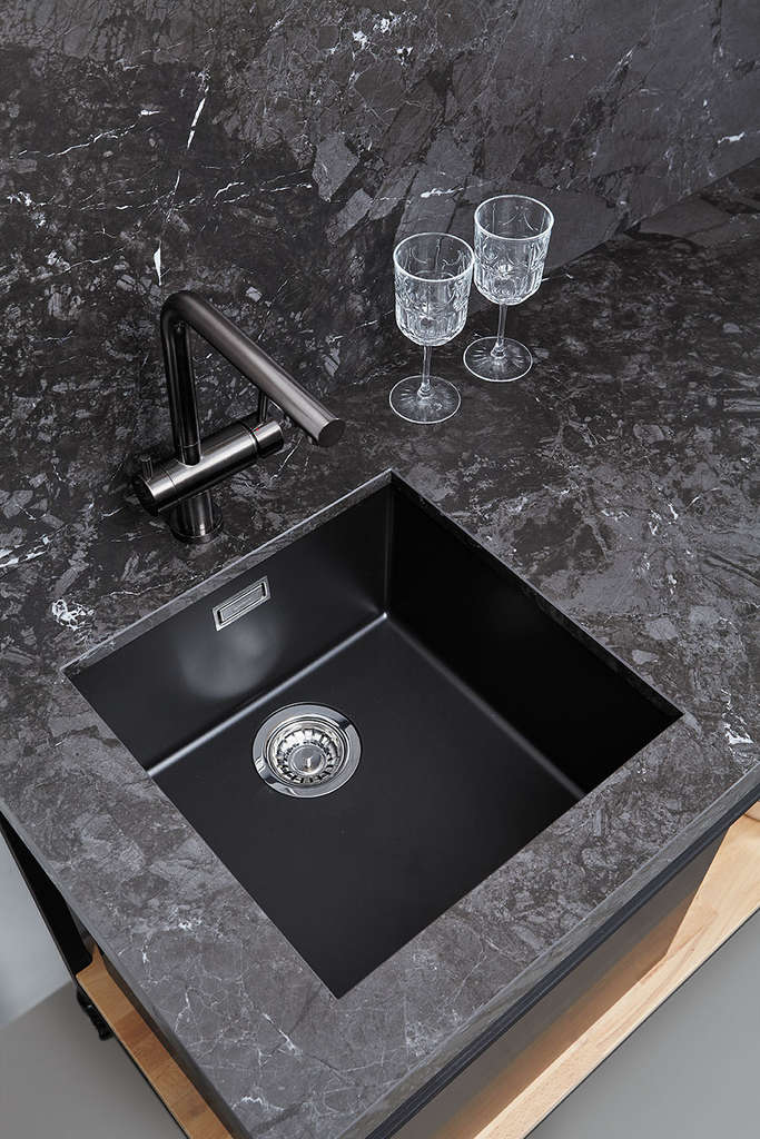 Интегрированная — встраиваемая модель из того же материала, что и столешница. Благодаря этому она выглядит как часть мебели.