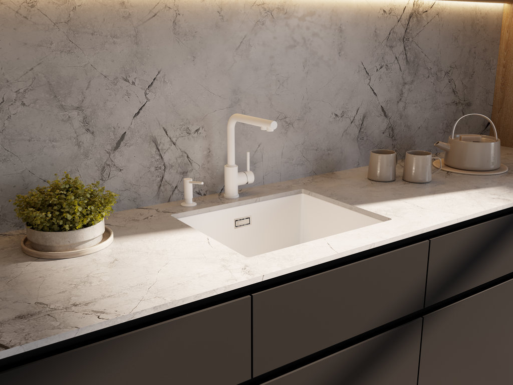 вровень со столешницей — создается ощущение бесшовного пространства, а если мойка сделана из того же материала, то и единого дизайна;