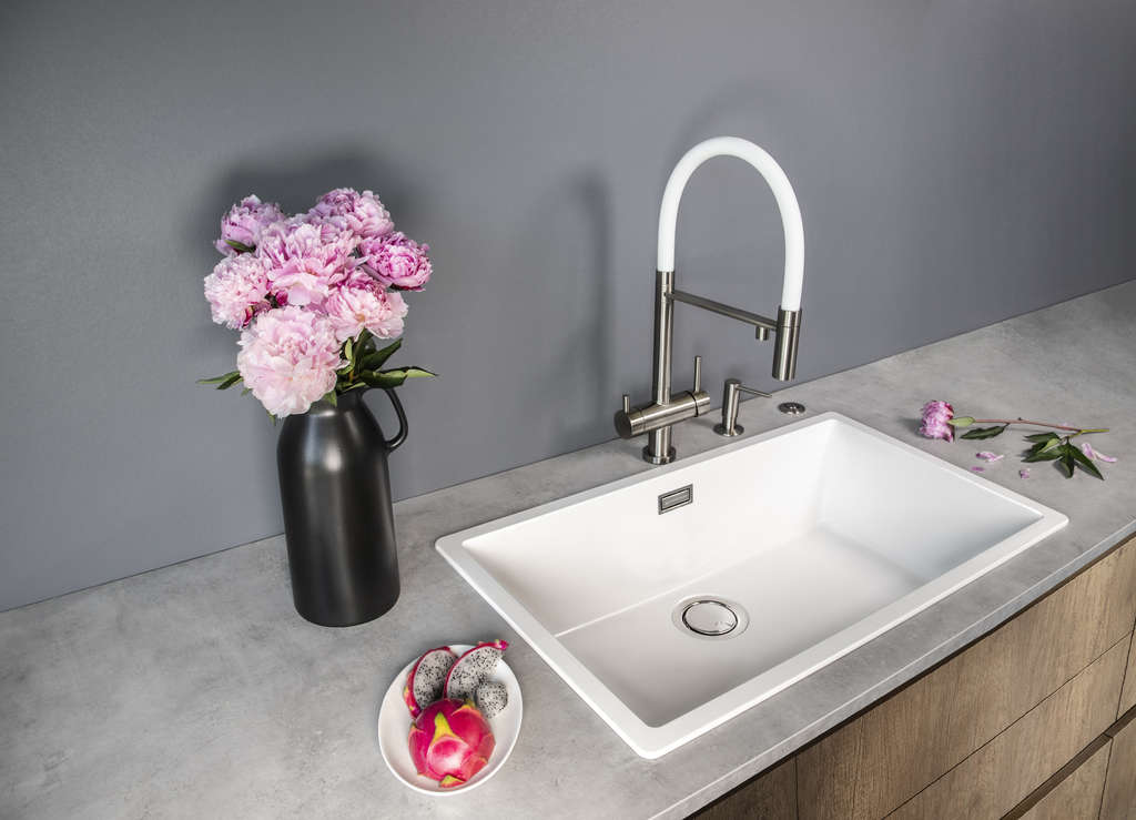 В комплекте поставляются корзинчатый вентиль и сифон, что снижает дополнительные траты и ускоряет пуск в работу. Корзинка облегчает улавливание мусора, а сифон обеспечивает надёжную гидрозамковую защиту от запахов. Монтаж под ламинат возможен и придаёт столешнице цельный, бесшовный вид.