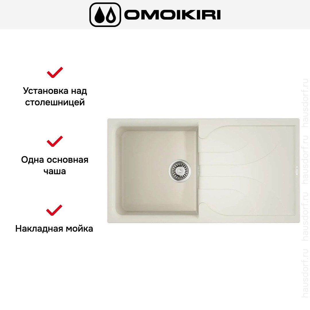 Накладная мойка Omoikiri — отличный выбор для тех, кто хочет создать гармоничное пространство с удобной сантехникой. простой в установке. Преимущество такой конструкции: легко подобрать практически к любой кухне и не придется демонтировать вместе с тумбой при ремонте или перестановке остальной мебели. Данная модель имеет стандартную форму, поэтому подходит большинству пользователей. Устанавливается над столешницей: это самый простой способ монтажа, зачастую с ним можно справиться даже без специалистов, главное — правильно рассчитать размеры ниши.