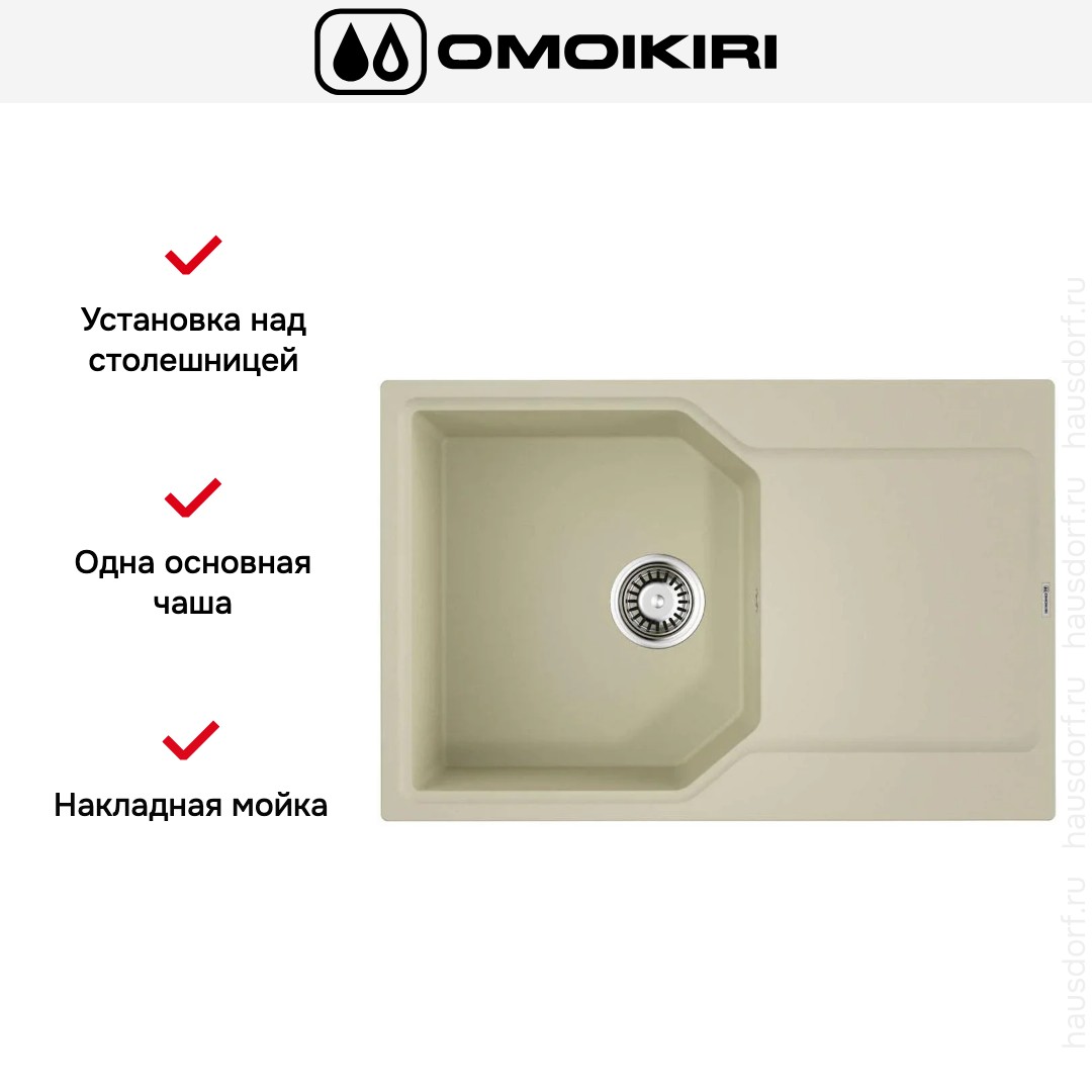 Накладная мойка Omoikiri — отличный выбор для тех, кто хочет создать гармоничное пространство с удобной сантехникой. простой в установке. Преимущество такой конструкции: легко подобрать практически к любой кухне и не придется демонтировать вместе с тумбой при ремонте или перестановке остальной мебели. Данная модель имеет стандартную форму, поэтому подходит большинству пользователей. Устанавливается над столешницей: это самый простой способ монтажа, зачастую с ним можно справиться даже без специалистов, главное — правильно рассчитать размеры ниши.