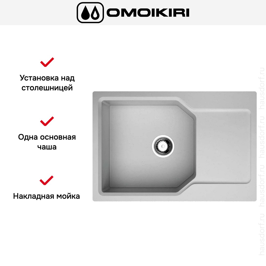 Накладная мойка Omoikiri — отличный выбор для тех, кто хочет создать гармоничное пространство с удобной сантехникой. простой в установке. Преимущество такой конструкции: легко подобрать практически к любой кухне и не придется демонтировать вместе с тумбой при ремонте или перестановке остальной мебели. Данная модель имеет стандартную форму, поэтому подходит большинству пользователей. Устанавливается над столешницей: это самый простой способ монтажа, зачастую с ним можно справиться даже без специалистов, главное — правильно рассчитать размеры ниши.