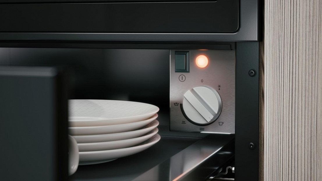 Современные встраиваемые подогреватели посуды имеют ряд особенностей, благодаря которым их использование становится удобнее и безопаснее. Они представляют собой выдвижные ящики, в нижней части которых, под дном, располагается нагревательный элемент. С его помощью температура в камере регулируется в диапазоне от 30 до 85-90°C. На задней стенке может быть установлен вентилятор, позволяющий нагретому воздуху распределяться равномерно. В ящике может размещаться до 12 комплектов посуды, включая глубокие и мелкие тарелки, блюдца, чашки. Чем меньше толщина нагревательного элемента, тем больше рабочий объем подогревателя и тем более компактно (в стопку) можно разместить посуду. Кроме того, плоский нагревательный элемент большой площади позволяет прогревать посуду более равномерно.