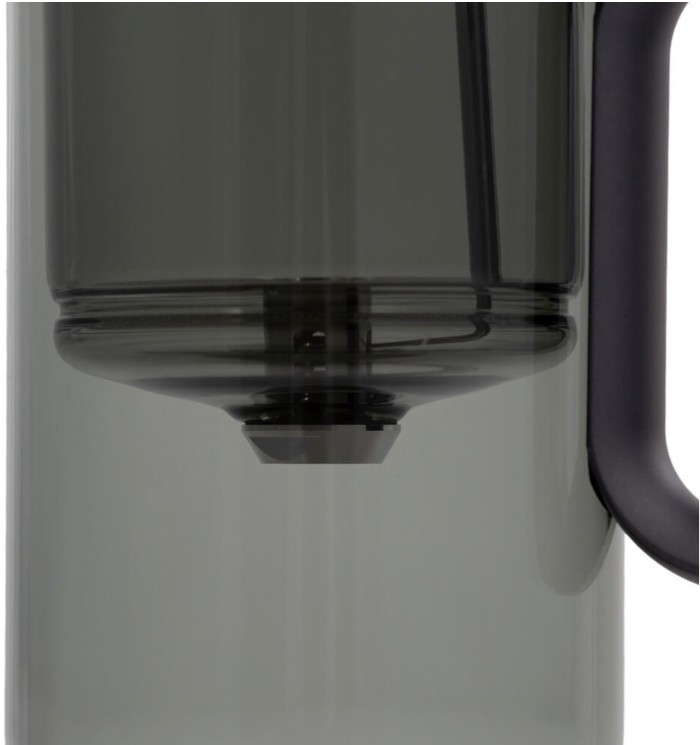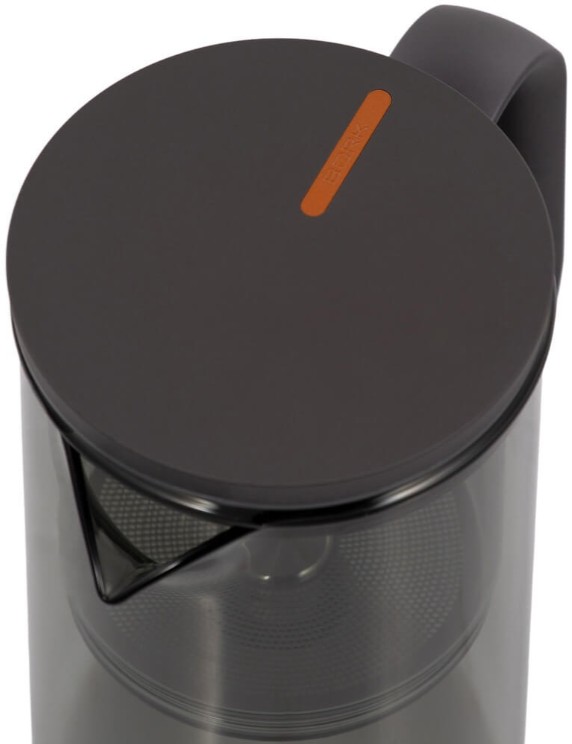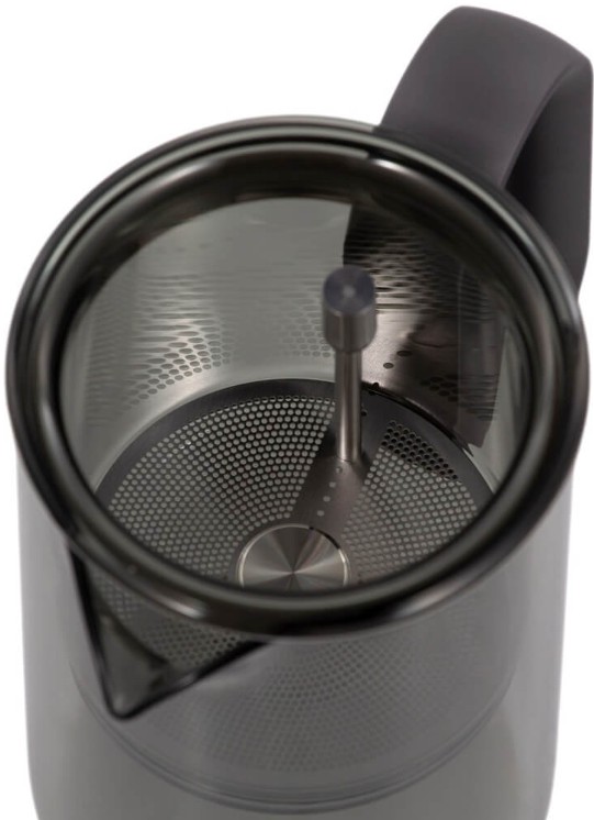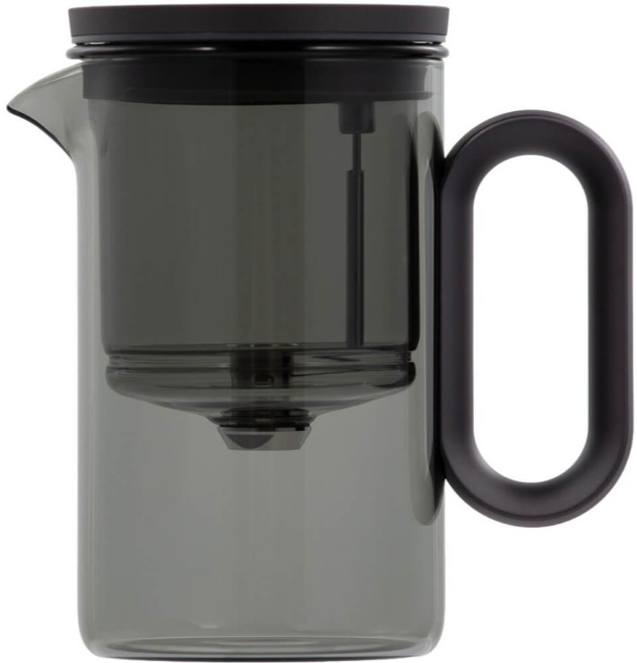 Компактный заварочный чайник в корпусе из черного стекла. Магнитный механизм позволяет перелить напиток в отдельный резервуар чайника одним касанием.