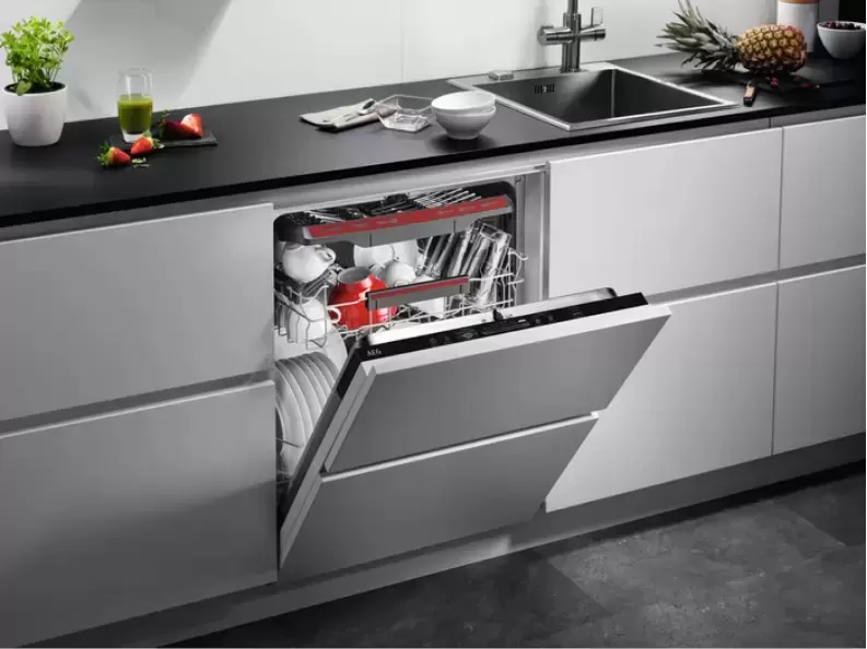 Встраиваемая модель АЕГ отлично впишется в любой интерьер, главное — правильно выбрать место, чтобы подвести коммуникации. Устанавливается в нишу целиком, полностью закрывается декоративной панелью. Обратите внимание: в комплекте не идет фасад, его необходимо установить самостоятельно. Имеет стандартные размеры, поэтому может не поместиться на очень маленькой кухне. В камеру можно загрузить ограниченное число комплектов: 14 шт. Комплектом считается набор посуды на одного человека, который нужен для полноценного приема пищи: глубокая и плоская тарелки, тарелка для салата, блюдце под чашку, сама чашка, ложка и вилка.