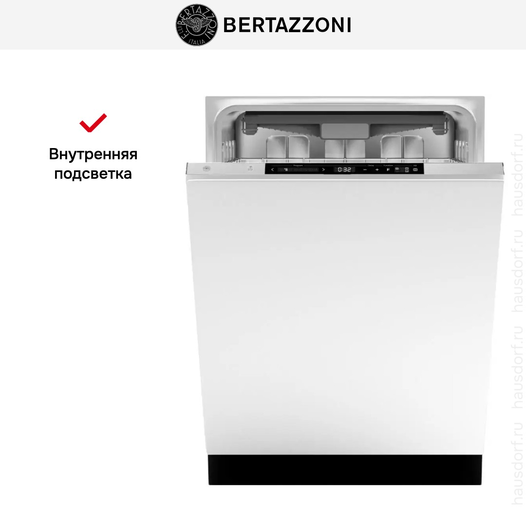 Bertazzoni DW6083PRT — встраиваемая посудомоечная машина из серии Master шириной 60 см с возможностью навески мебельного фасада. Максимальная загрузка составляет 15 стандартных комплектов посуды. Турбосушка с обдувом горячим воздухом и автоматическим открытием дверцы сокращает длительность цикла: посуда остается совершенно сухой, без капель и разводов. Закрытая панель управления оснащена сенсорными кнопками Touch Control и дисплеем. Три разбрызгивателя позволяют распределить воду по всему пространству камеры. Модель имеет восемь стандартных программ, в том числе мойку стекла, программу мытья за 90 минут, гигиеничную мойку для детской посуды. Можно активировать опции дополнительной сушки и дополнительной гигиенической обработки посуды, добавить функции энергосбережения, экономии ресурсов, самоочистки.