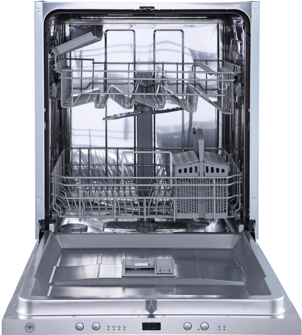 Встраиваемая модель Бертаззони отлично впишется в любой интерьер, главное — правильно выбрать место, чтобы подвести коммуникации. Устанавливается в нишу целиком, полностью закрывается декоративной панелью. Обратите внимание: в комплекте не идет фасад, его необходимо установить самостоятельно. Имеет стандартные размеры, поэтому может не поместиться на очень маленькой кухне. В камеру можно загрузить ограниченное число комплектов: 13 шт. Комплектом считается набор посуды на одного человека, который нужен для полноценного приема пищи: глубокая и плоская тарелки, тарелка для салата, блюдце под чашку, сама чашка, ложка и вилка.