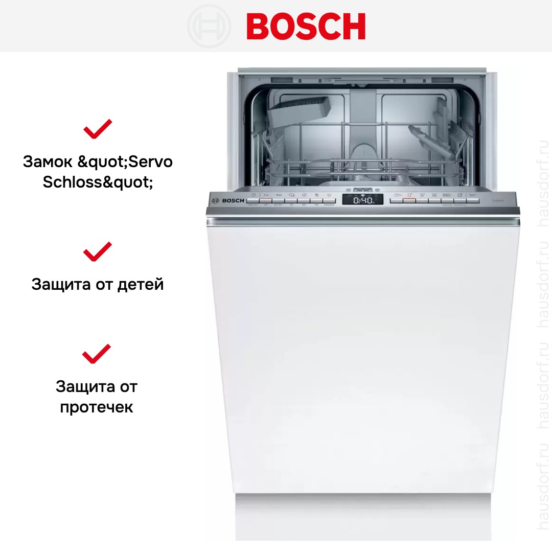 Встраиваемая посудомоечная машина Bosch SPV4HKX45E предлагает элегантный и продуманный вид, созданный для полностью встраиваемой установки в нишу 45 см. Модель узкой компоновки занимает минимум места и легко прячется под фасадом кухни. Верхняя часть панели управления выполнена из нержавеющей стали и аккуратно закрыта, что сохраняет единый фасадный рисунок и делает фронт практичным и эстетичным. Цифровой дисплей и кнопки управления расположены под закрытой панелью, поэтому интерфейс остается доступным, но не нарушает дизайн мебели.